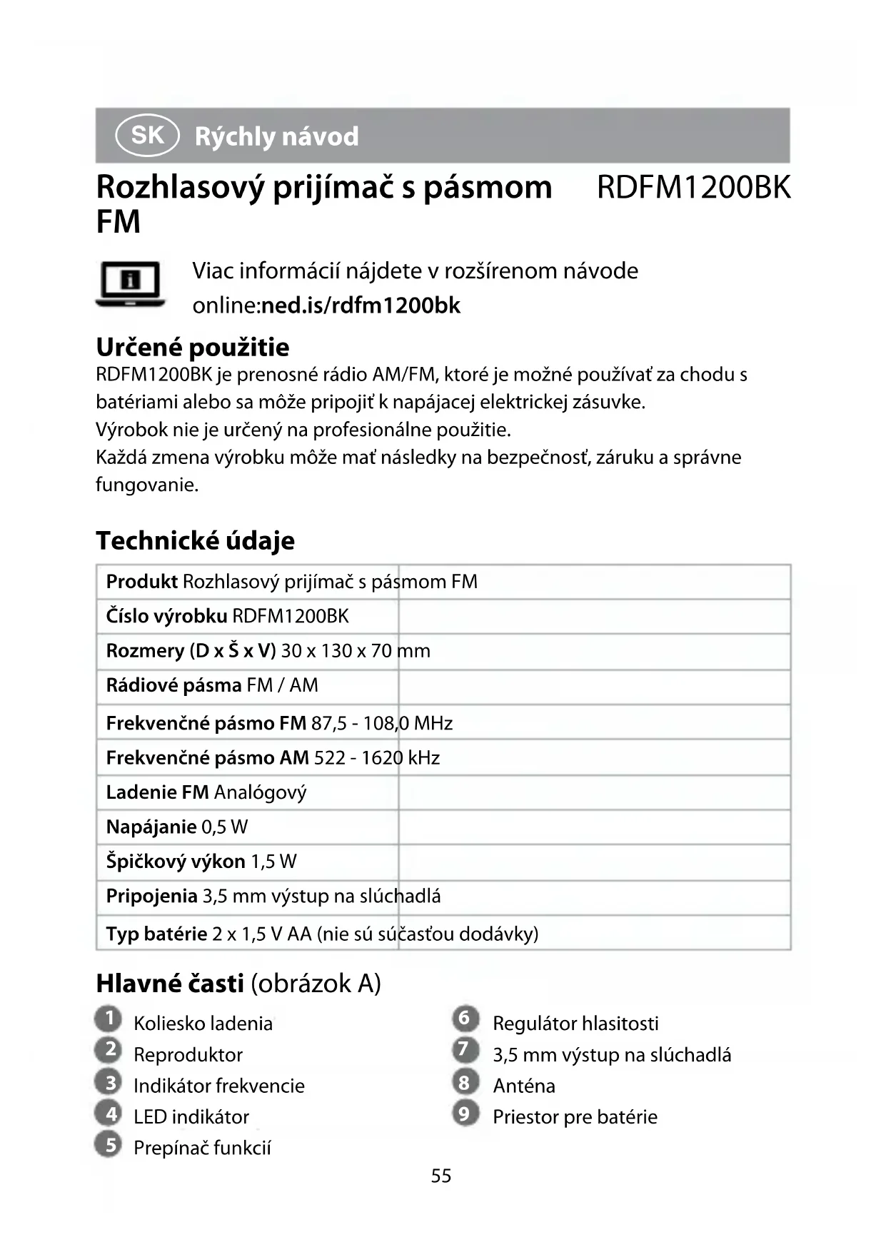 RDFM1200BK Viac informácií nájdete v rozšírenom návode online:ned.is/rdfm1200bk Určené použitie RDFM1200BK je prenosné rádio AM/FM, ktoré je možné používať za chodu s batériami alebo sa môže pripojiť k napájacej elektrickej zásuvke. Výrobok nie je určený na profesionálne použitie. Každá zmena výrobku môže mať následky na bezpečnosť, záruku a správne fungovanie. Technické údaje Produkt Rozhlasový prijímač s pásmom FM Číslo výrobku RDFM1200BK Rozmery (D x Š x V) 30 x 130 x 70 mm Rádiové pásma FM / AM Frekvenčné pásmo FM 87,5 - 108,0 MHz Frekvenčné pásmo AM 522 - 1620 kHz Ladenie FM Analógový Napájanie 0,5 W Špičkový výkon 1,5 W Pripojenia 3,5 mm výstup na slúchadlá Typ batérie 2 x 1,5 V AA (nie sú súčasťou dodávky) Hlavné časti (obrázok A)