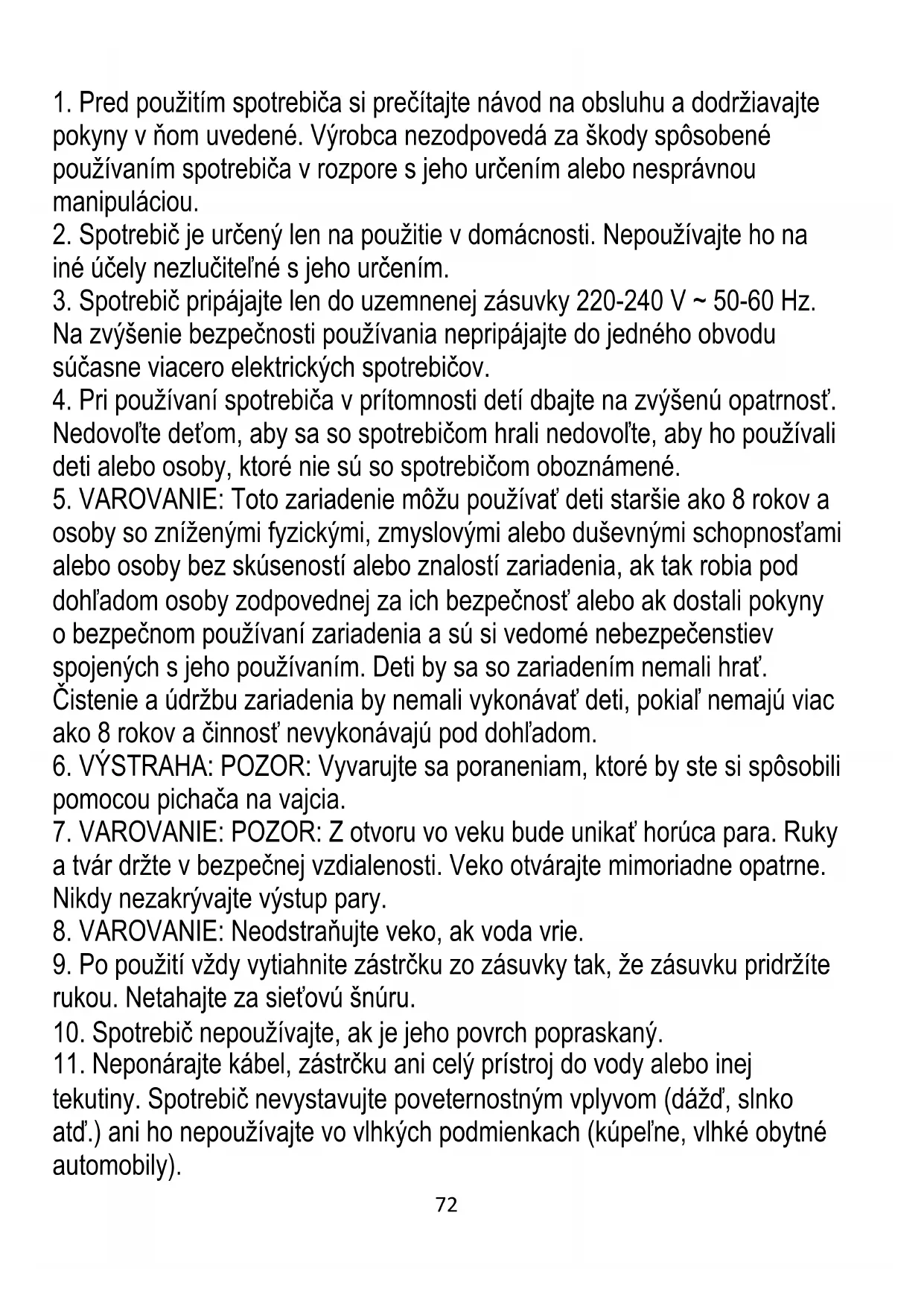 osoby so zníženými fyzickými, zmyslovými alebo duševnými schopnosťami alebo osoby bez skúseností alebo znalostí zariadenia, ak tak robia pod dohľadom osoby zodpovednej za ich bezpečnosť alebo ak dostali pokyny o bezpečnom používaní zariadenia a sú si vedomé nebezpečenstiev spojených s jeho používaním. Deti by sa so zariadením nemali hrať. Čistenie a údržbu zariadenia by nemali vykonávať deti, pokiaľ nemajú viac ako 8 rokov a činnosť nevykonávajú pod dohľadom.