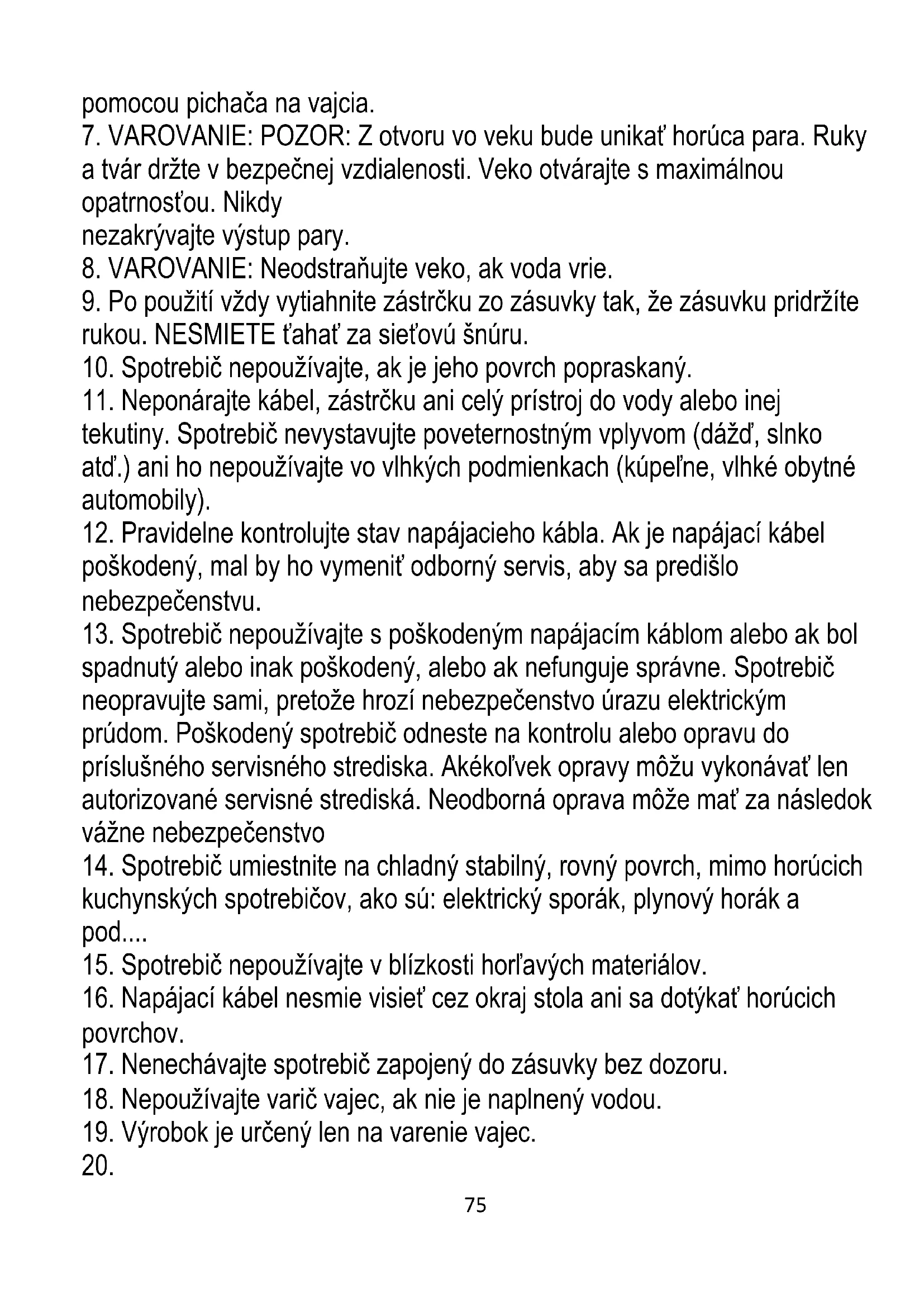 18. Nepoužívajte varič vajec, ak nie je naplnený vodou.