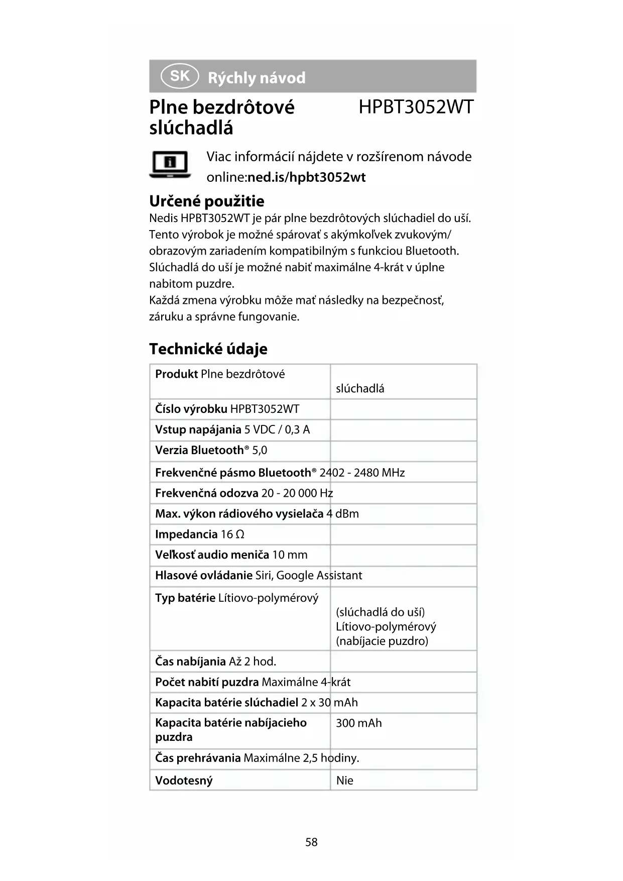 Rýchly návod Plne bezdrôtové slúchadlá HPBT3052WT Viac informácií nájdete v rozšírenom návode online:ned.is/hpbt3052wt Určené použitie Nedis HPBT3052WT je pár plne bezdrôtových slúchadiel do uší. Tento výrobok je možné spárovať s akýmkoľvek zvukovým/ obrazovým zariadením kompatibilným s funkciou Bluetooth. Slúchadlá do uší je možné nabiť maximálne 4-krát v úplne nabitom puzdre. Každá zmena výrobku môže mať následky na bezpečnosť, záruku a správne fungovanie. Technické údaje Produkt Plne bezdrôtové slúchadlá Číslo výrobku HPBT3052WT Vstup napájania 5 VDC / 0,3 A Verzia Bluetooth® 5,0 Frekvenčné pásmo Bluetooth® 2402 - 2480 MHz Frekvenčná odozva 20 - 20000 Hz Max. výkon rádiového vysielača 4 dBm Impedancia 16 Ω Veľkosť audio meniča 10 mm Hlasové ovládanie Siri, Google Assistant Typ batérie Lítiovo-polymérový (slúchadlá do uší) Lítiovo-polymérový (nabíjacie puzdro) Čas nabíjania Až 2 hod. Počet nabití puzdra Maximálne 4-krát Kapacita batérie slúchadiel 2 x 30 mAh Kapacita batérie nabíjacieho puzdra 300 mAh Čas prehrávania Maximálne 2,5 hodiny. Vodotesný Nie59 Hlavné časti (obrázok A)
