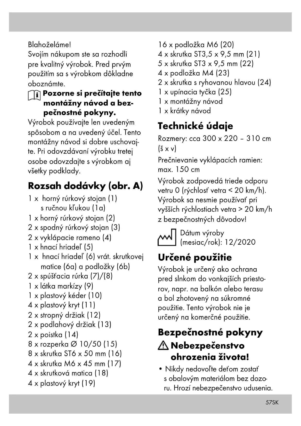 - Pri extrémnych poveternostných podmienkach, napr. pri silnom vetre výrobok zaistite. Výrobok skladujte v chránených priesto- roch. Dôležité informácie pred montážou UPOZORNENIE! Pre optimál- nu stabilitu výrobku odporúčame zoskrutkovať podlahové a stropné držiaky, najmä na balkónoch alebo na montážnych miestach, ktoré nie sú na úrovni so zemou. Pri nezoskrut- kovaní výrobku k podlahe a stropu výrobca nepreberá akúkoľvek záruku. UPOZORNENIE! Skôr než začne- te s montážou výrobku, zmerajte výšku medzi podlahou a stropom. UPOZORNENIE! Montáž výrobku by mali z dôvodu veľkosti vykonávať najmenej dve osoby. UPOZORNENIE! Z dôvodu poža- dovaného použitia nástrojov/strojov sú bezpodmienečné remeselnícke znalosti. Vhodná montážna plocha Pri stropnej montáži je vhodný be- tónový strop alebo nosná drevená konštrukcia. Na montáž na podlahu je vhodný betónový základ alebo betónové platne s min. rozmermi 50 x 50 x 5 cm (d x š x h). Upozornenie: Ak výrobok pri- montujete na nosnú drevenú kon- štrukciu, musíte výrobok k nej pris- krutkovať, pretože drevo mení svoj tvar v závislosti od teploty a vlhkosti. O vhodnom montážnom materiáli sa informujte v špecializovanej predaj- ni. Upozornenie: Ďalšie podmienky montáže, ako je nosnosť a pevnosť musí preveriť špecializovaná pre- vádzka. Vhodný montážny materiál Pred montážou výrobku sa musí určiť montážny materiál. Ak je montážna plocha nosná, musí sa vybrať vhodný montážny materiál na upevnenie. Upevňovací materiál: