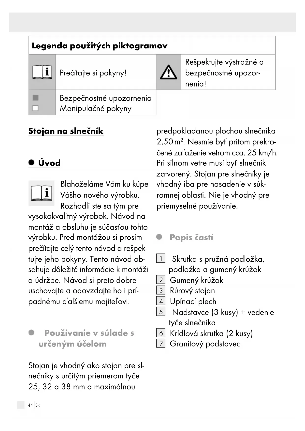 Granitový podstavec45 SK Technické údaje Č. výrobku: 354883_2004 (85897KASR/Q) Výška podstavca v cm: 6,5 Výška upevňovacej tyče v cm: 0 Šírka v cm: 38 Dĺžka v cm: 38 Použiteľné šírky tyče v mm: 25, 32 + 38 Hmotnosť v kg: cca. 25 Č. výrobku: 354884_2004 (85897KASR/Q) Výška podstavca v cm: 9 Výška upevňovacej tyče v cm: 30 Priemer v cm: 38 Použiteľné šírky tyče v mm: 25, 32 + 38 Hmotnosť v kg: cca. 25 Geometria žrde v spojovacej oblasti: pre okrúhle slneč- níkové tyče Hĺbka vsunutia žrde v mm: 200 Max. hmotnosť slnečníka v kg: 5 Upozornenia k max. excentricite slnečníka: iba pre slnečníky so žrďami v strede slnečníka (ne- vhodné pre konzo- lové slnečníky) Všetky údaje sú približné hodnoty. Technické zmeny vyhradené. Bezpečnostné upozornenia Dodržiavajte prosím nasledujúce bezpečnostné upozornenia. Za škody vzniknuté v dôsledku nedodr- žiavania pokynov výrobca neručí. Vyberte stojan slnečníka z obalu a odstráňte všetok obalový ma- teriál. Obalové materiály držte v bezpečnej vzdialenosti od detí. Pri prehltnutí hrozí nebezpečen- stvo zadusenia. Obal ekologicky zlikvidujte. Skontrolujte, či je ob- sah dodávky kompletný a či sl- nečník nevykazuje poškodenia.46 SK Stojan pre slnečník nie je hračka. Deti si môžu pomliaždiť prsty a chodidlá. Stojan pre slnečník nikdy nene- chávajte stáť bez dozoru – ak stojan spadne, môže spôsobiť ťažké poranenia. Myslite na to, že závisle od sily vetra a prie- meru slnečníka môže byť i stojan pre slnečník príliš ľahký. Zabezpečte, aby bol Váš slneč- ník pri prichádzajúcom vetre za- tvorený. Bezpodmienečne dbajte na ná- rodné predpisy platné vo Vašej krajine, ktoré sú platné doda- točne popri predpisoch uvede- ných v tomto návode. Montáž Budete potrebovať: – 17-ku nástrčný kľúč – 1 nápomocnú osobu Montáž podstavca Zabezpečte, aby bol stojan pre slnečník umiestnený na pevnom/ stabilnom ako aj vodorovnom/ rovnom podklade. Neumiestňujte stojan pre slnečník na nevhodný podklad. Pri umiestnení stojana pre slneč- ník dbajte na pevný/stabilný ako aj vodorovný/rovný povrch. Postavte podstavec