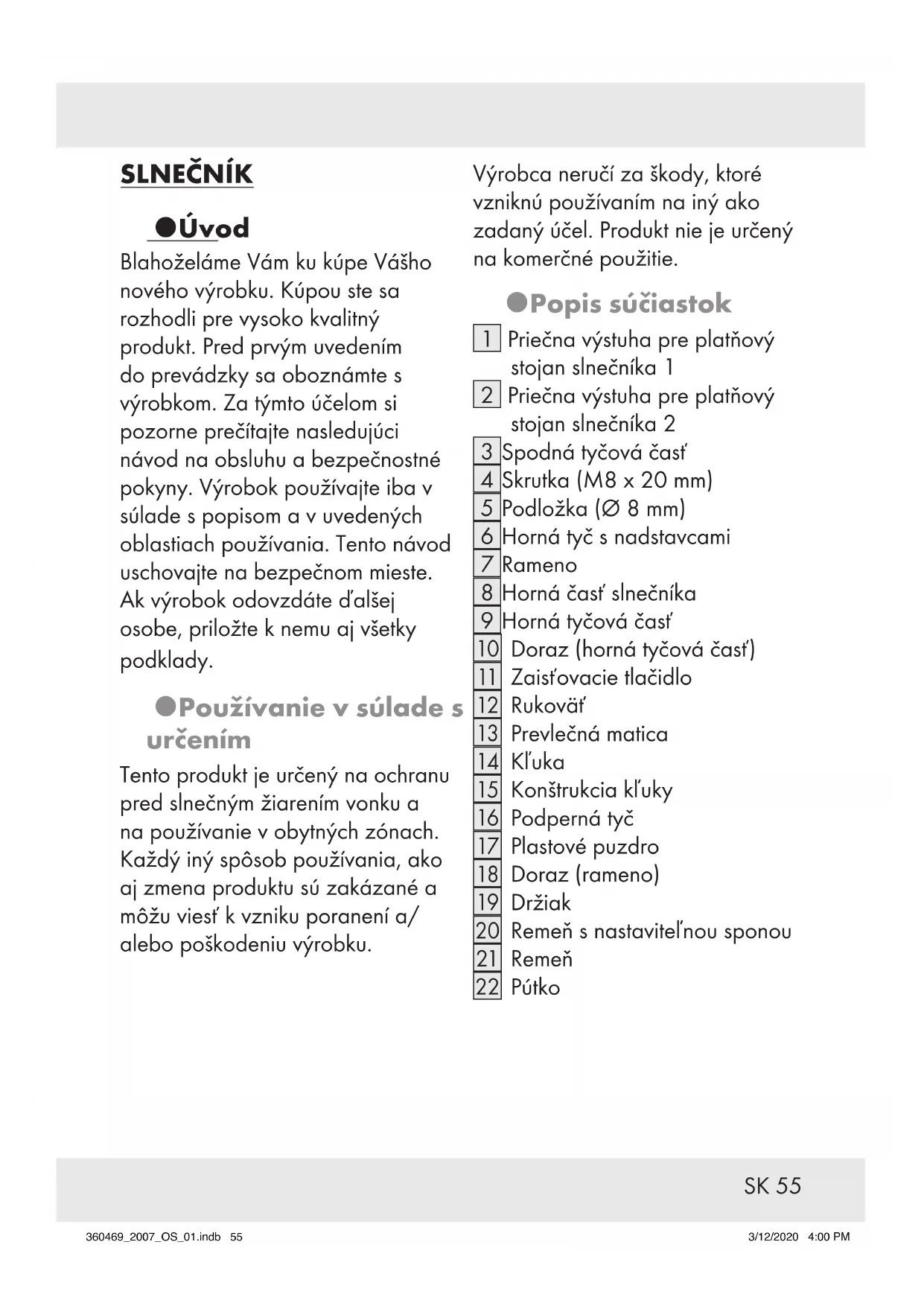 (obrázokN). Čistenie a starostlivosť Produkt čistite mierne navlhčenou nechlpatou handrou. Produkt v zime uskladnite na chladnom a suchom mieste– zabráňte skladovaniu vo vykurovanej miestnosti. Likvidácia Obal pozostáva z ekologických materiálov, ktoré môžete odovzdať na miestnych recyklačných zberných miestach. O možnostiach likvidácie opotrebovaného výrobku sa môžete informovať na Vašej obecnej alebo mestskej správe. Záruka Tento výrobok bol dôkladne vyrobený podľa prísnych akostných smerníc a pred dodaním svedomito testovaný. V prípade nedostatkov tohto výrobku Vám prináležia zákonné práva voči predajcovi produktu. Tieto zákonné práva nie sú našou nižšie uvedenou zárukou obmedzené. Na tento produkt poskytujeme 3-ročnú záruku od dátumu nákupu. Záručná doba začína plynúť dátumom kúpy. Starostlivo si prosím uschovajte originálny pokladničný lístok. Tento doklad je potrebný ako dôkaz o kúpe. 360469_2007_OS_01.indb 61360469_2007_OS_01.indb 61 3/12/2020 4:00 PM3/12/2020 4:00 PM62
