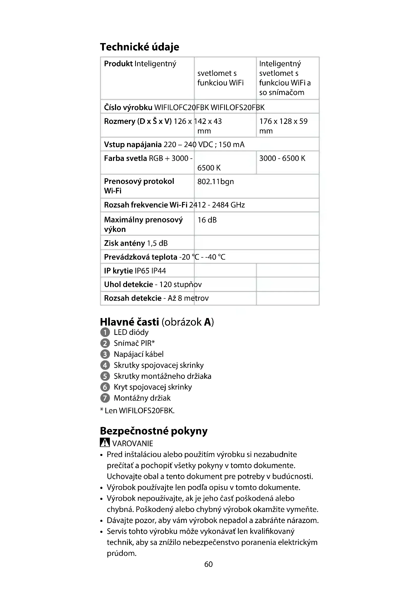 Vstup napájania 220 – 240 VDC ; 150 mA Farba svetla RGB + 3000 - 6500 K 3000 - 6500 K Prenosový protokol Wi-Fi 802.11bgn Rozsah frekvencie Wi-Fi 2412 - 2484 GHz Maximálny prenosový výkon 16 dB Zisk antény 1,5 dB Prevádzková teplota -20 °C - -40 °C IP krytie IP65 IP44 Uhol detekcie - 120 stupňov Rozsah detekcie - Až 8 metrov Hlavné časti (obrázok A) 1 LED diódy 2 Snímač PIR* 3 Napájací kábel 4 Skrutky spojovacej skrinky 5 Skrutky montážneho držiaka 6 Kryt spojovacej skrinky 7 Montážny držiak