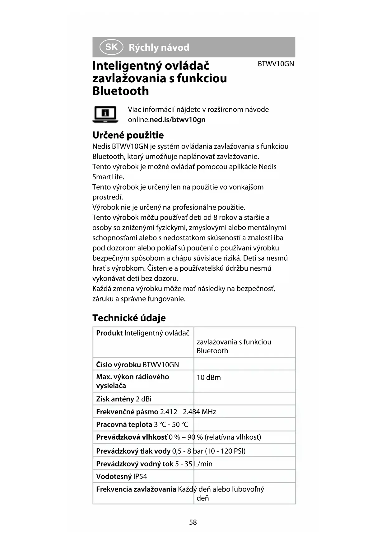 Rýchly návod Inteligentný ovládač zavlažovania s funkciou Bluetooth BTWV10GN Viac informácií nájdete v rozšírenom návode online:ned.is/btwv10gn Určené použitie Nedis BTWV10GN je systém ovládania zavlažovania s funkciou Bluetooth, ktorý umožňuje naplánovať zavlažovanie. Tento výrobok je možné ovládať pomocou aplikácie Nedis SmartLife. Tento výrobok je určený len na použitie vo vonkajšom prostredí. Výrobok nie je určený na profesionálne použitie. Tento výrobok môžu používať deti od 8 rokov a staršie a osoby so zníženými fyzickými, zmyslovými alebo mentálnymi schopnosťami alebo s nedostatkom skúseností a znalostí iba pod dozorom alebo pokiaľ sú poučení o používaní výrobku bezpečným spôsobom a chápu súvisiace riziká. Deti sa nesmú hrať s výrobkom. Čistenie a používateľskú údržbu nesmú vykonávať deti bez dozoru. Každá zmena výrobku môže mať následky na bezpečnosť, záruku a správne fungovanie. Technické údaje Produkt Inteligentný ovládač zavlažovania s funkciou Bluetooth Číslo výrobku BTWV10GN Max. výkon rádiového vysielača 10 dBm Zisk antény 2 dBi Frekvenčné pásmo 2.412 - 2.484 MHz Pracovná teplota 3 °C - 50 °C Prevádzková vlhkosť 0 % – 90 % (relatívna vlhkosť) Prevádzkový tlak vody 0,5 - 8 bar (10 - 120 PSI) Prevádzkový vodný tok 5 - 35 L/min Vodotesný IP54 Frekvencia zavlažovania Každý deň alebo ľubovoľný deň59 Počet zavlažovaní Max. 3-krát za deň Trvanie zavlažovania 1 min. - 11 h 59 min. Trvanie rosenia 5 s - 59 s Max. dĺžka intervalu 15 min. 59 s Perióda rosenia 1 min. - 11 h 59 min. Typ batérie 4 x AA (nie sú súčasťou dodávky) Hlavné časti (obrázok A) 1 LED indikátor stavu 2 Ovládacie tlačidlo 3 Otvor pre priehradku pre batérie 4 Priestor pre batérie 5 Vodný lter 6 Prívod vody 7 Výstup vody Prehľad aplikácie (obrázok B) 1 Posledné použitie vody 2 Stav batérie / Aktuálne aktívny režim / Zostávajúci čas do nasledujúceho zavlažovania 3 Manuálny režim 4 Parameter 5 Prepnutie medzi stupňami Celzia a Fahrenheita. 6 Nastavenie časových harmonogramov zavlažovania 7 Snímač 8 Podrobnosti a pokyny Bezpečnostné pokyny