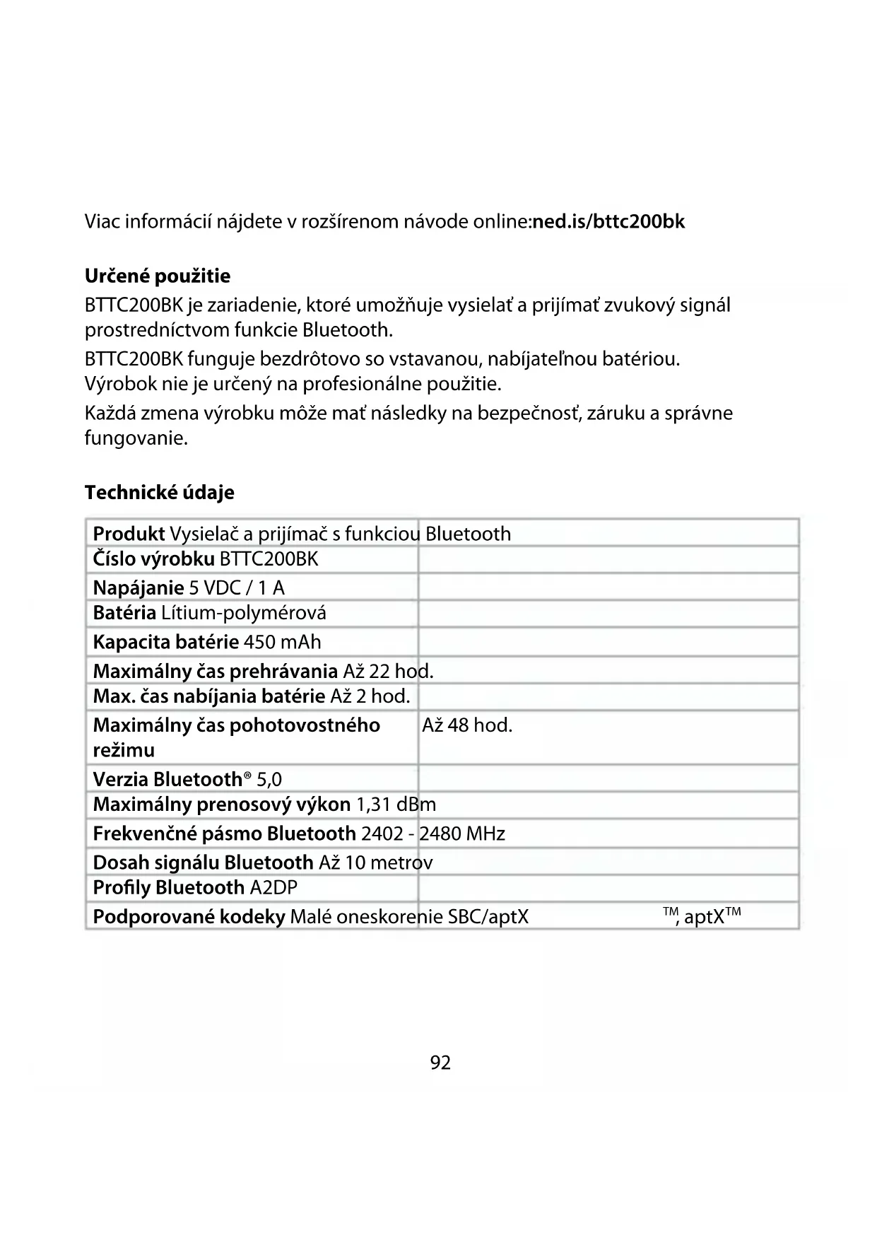 Rýchly návod Vysielač a prijímač s funkciou Bluetooth BTTC200BK92 Viac informácií nájdete v rozšírenom návode online:ned.is/bttc200bk Určené použitie BTTC200BK je zariadenie, ktoré umožňuje vysielať a prijímať zvukový signál prostredníctvom funkcie Bluetooth. BTTC200BK funguje bezdrôtovo so vstavanou, nabíjateľnou batériou. Výrobok nie je určený na profesionálne použitie. Každá zmena výrobku môže mať následky na bezpečnosť, záruku a správne fungovanie. Technické údaje Produkt Vysielač a prijímač s funkciou Bluetooth Číslo výrobku BTTC200BK Napájanie 5 VDC / 1 A Batéria Lítium-polymérová Kapacita batérie 450 mAh Maximálny čas prehrávania Až 22 hod. Max. čas nabíjania batérie Až 2 hod. Maximálny čas pohotovostného režimu Až 48 hod. Verzia Bluetooth® 5,0 Maximálny prenosový výkon 1,31 dBm Frekvenčné pásmo Bluetooth 2402 - 2480 MHz Dosah signálu Bluetooth Až 10 metrov Proly Bluetooth A2DP Podporované kodeky Malé oneskorenie SBC/aptX
