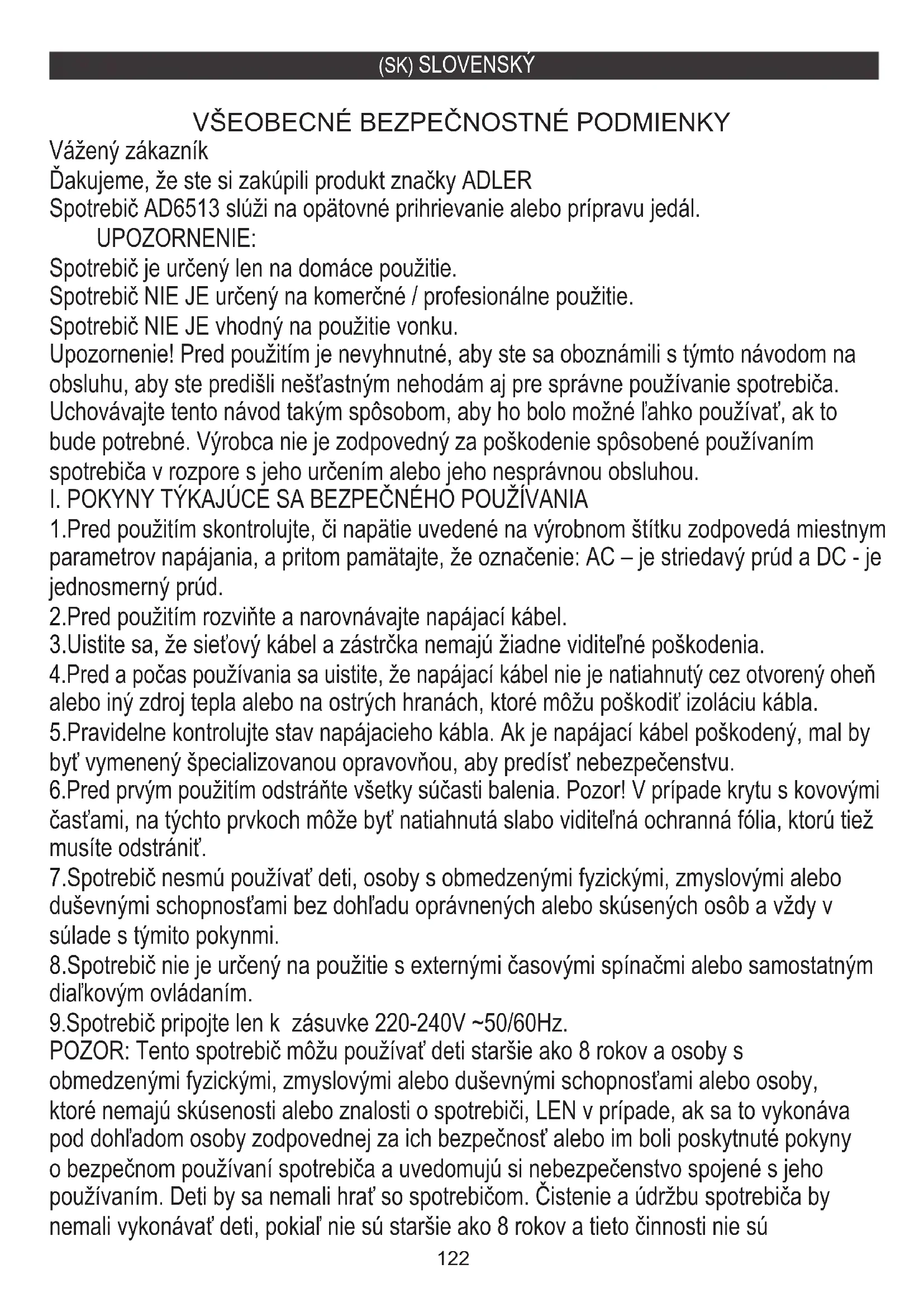 Vážený zákazník Ďakujeme, že ste si zakúpili produkt značky ADLER Spotrebič je určený len na domáce použitie. Spotrebič NIE JE vhodný na použitie vonku. 1.Pred použitím skontrolujte, či napätie uvedené na výrobnom štítku zodpovedá miestnym parametrov napájania, a pritom pamätajte, že označenie: AC – je striedavý prúd a DC - je jednosmerný prúd. 5.Pravidelne kontrolujte stav napájacieho kábla. Ak je napájací kábel poškodený, mal by byť vymenený špecializovanou opravovňou, aby predísť nebezpečenstvu. 6.Pred prvým použitím odstráňte všetky súčasti balenia. Pozor! V prípade krytu s kovovými časťami, na týchto prvkoch môže byť natiahnutá slabo viditeľná ochranná fólia, ktorú tiež musíte odstrániť. Spotrebič AD6513 slúži na opätovné prihrievanie alebo prípravu jedál. UPOZORNENIE: Spotrebič NIE JE určený na komerčné / profesionálne použitie. Upozornenie! Pred použitím je nevyhnutné, aby ste sa oboznámili s týmto návodom na obsluhu, aby ste predišli nešťastným nehodám aj pre správne používanie spotrebiča. Uchovávajte tento návod takým spôsobom, aby ho bolo možné ľahko používať, ak to bude potrebné. Výrobca nie je zodpovedný za poškodenie spôsobené používaním spotrebiča v rozpore s jeho určením alebo jeho nesprávnou obsluhou.