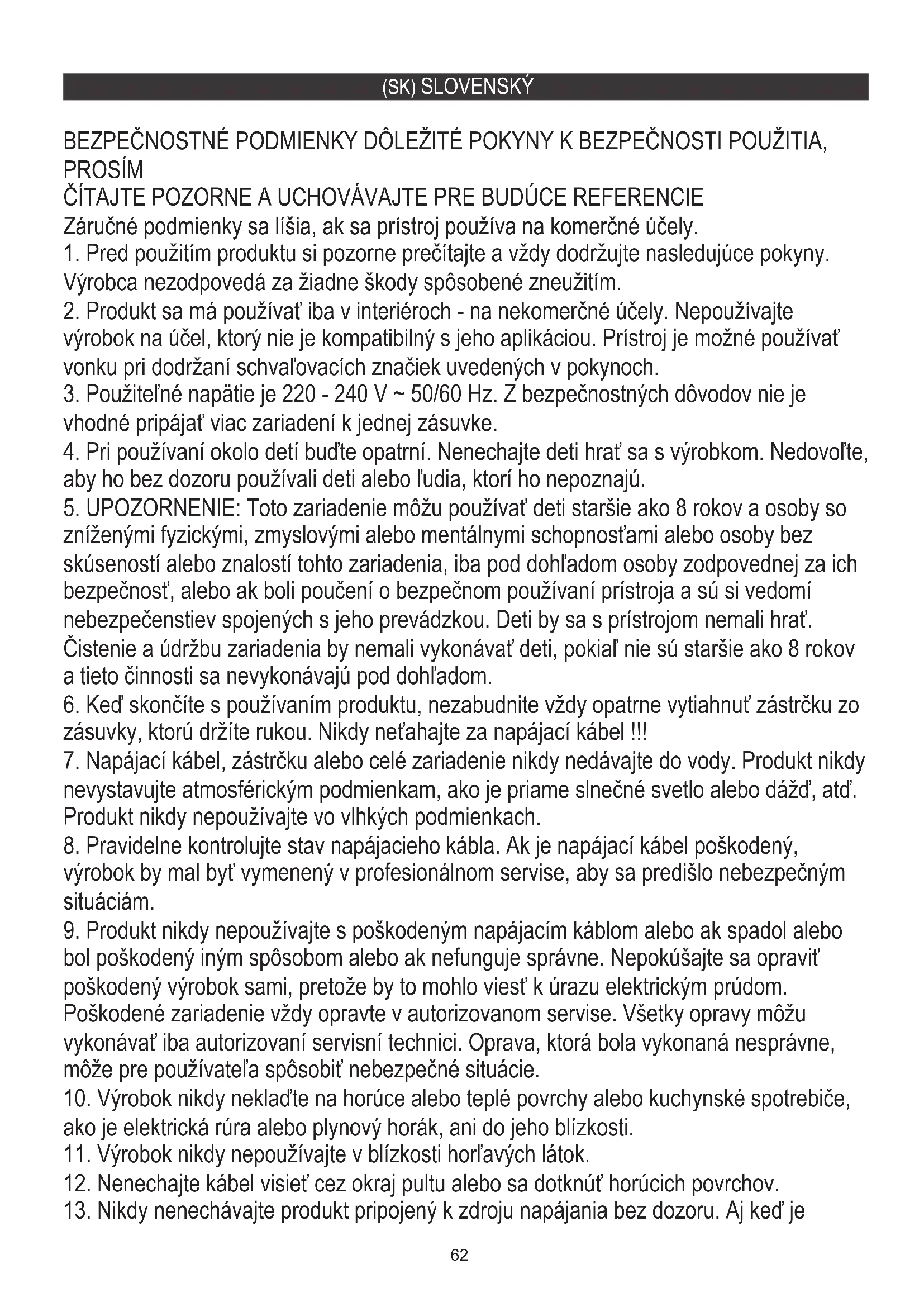 BEZPEČNOSTNÉ PODMIENKY DÔLEŽITÉ POKYNY K BEZPEČNOSTI POUŽITIA, PROSÍM Záručné podmienky sa líšia, ak sa prístroj používa na komerčné účely. ČÍTAJTE POZORNE A UCHOVÁVAJTE PRE BUDÚCE REFERENCIE