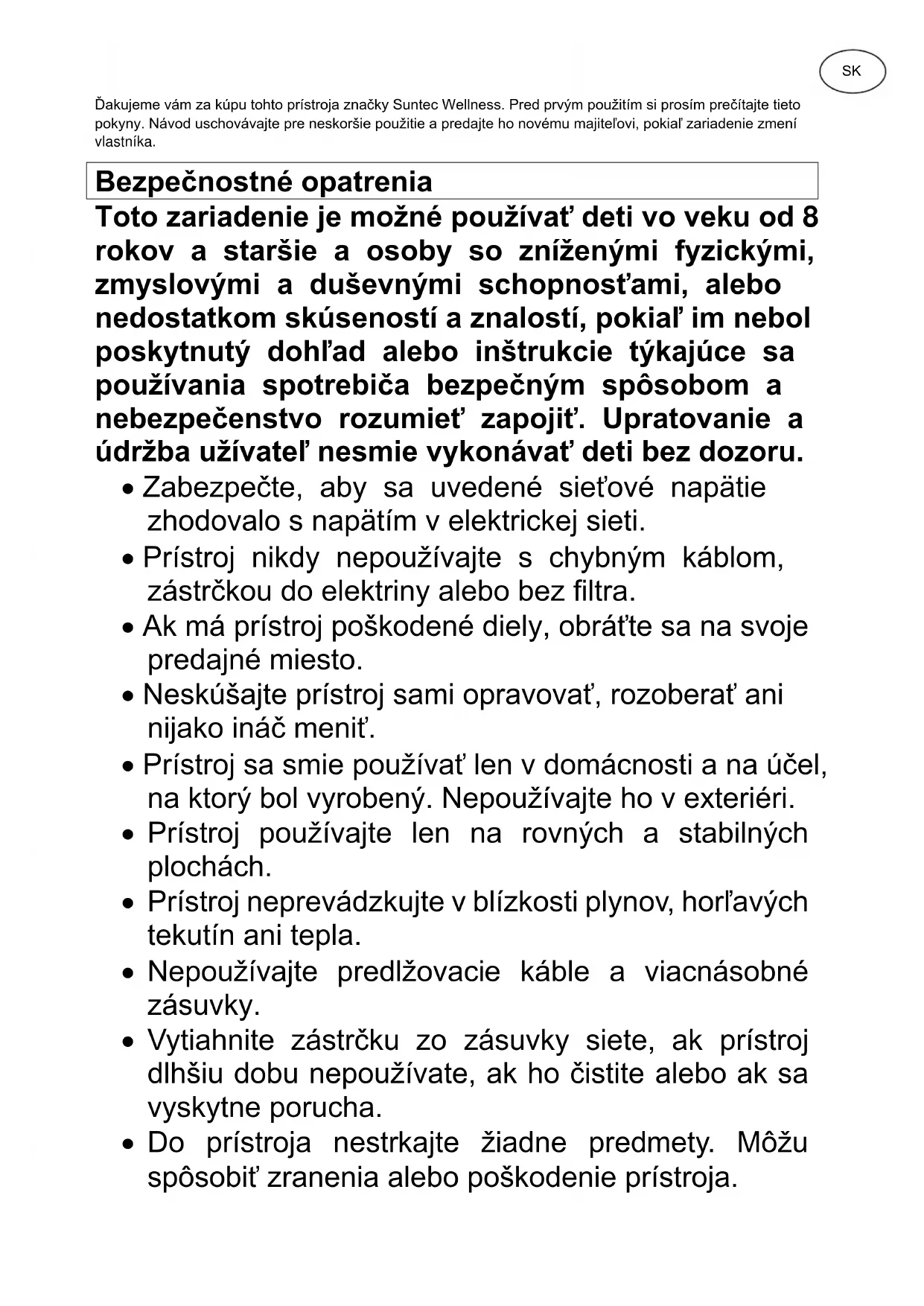 - Po uplynutí záruky môže špecializovaný predajca alebo servis vykonávať opravy na Vaše náklady. Poznámky k ochrane životného prostredia Tento výrobok nesmie byť na konci svojej upotrebiteľnosti likvidovaný v bežnom domácom odpade, ale musí byť odovzdaný na zbernom mieste určenom k likvidácii elektrických a elektronických zariadení. Na túto skutočnosť upozorňuje symbol na výrobku, návode na použitie alebo na obale. Suroviny sú podľa svojho označenia opäť použiteľné. Vďaka opätovnému použitiu, recykláciou surovín alebo iným formám recyklácie starých zariadení významne prispievate k ochrane životného prostredia. Príslušné miesto pre likvidáciu odpadu si zistíte na obecnom úrade. V rámci našej rozšírenej zodpovednosti výrobcu je tento prístroj označený v súlade s Európskou smernicou 2002/96/EG o starých elektrických a elektronických spotrebičoch (WEEE). Cieľom je zamedzovanie vzniku elektrického odpadu, jeho znižovanie a ekologická likvidácia. Prosím pomôžte aktívne chrániť životné prostredie a elektrický odpad likvidujte prostredníctvom miestnych zberných miest. Obal ako aj tento návod k obsluhe sú recyklovateľné.EU Prehlásenie o zhode Prístroj odpovedá zásadným požiadavkám Európskej únie na zdravie a bezpečnosť. EU Prehlásenie o zhode je základom pre označenie CE tohto prístroja. S vydaním tohto návodu na obsluhu strácajú svoju platnosť všetky doterajšie návody na obsluhu. SUNTEC, SUNTEC Wellness, KLIMATRONIC a logo slnka sú registrované známky. © 2021/01 SUNTEC WELLNESS GMBH Zodpovednosť je pre všetky tlačové chyby a opomenutia vylúčené.