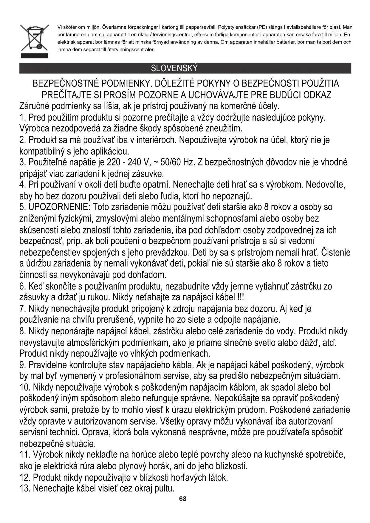 zníženými fyzickými, zmyslovými alebo mentálnymi schopnosťami alebo osoby bez skúseností alebo znalostí tohto zariadenia, iba pod dohľadom osoby zodpovednej za ich bezpečnosť, príp. ak boli poučení o bezpečnom používaní prístroja a sú si vedomí nebezpečenstiev spojených s jeho prevádzkou. Deti by sa s prístrojom nemali hrať. Čistenie a údržbu zariadenia by nemali vykonávať deti, pokiaľ nie sú staršie ako 8 rokov a tieto činnosti sa nevykonávajú pod dohľadom.