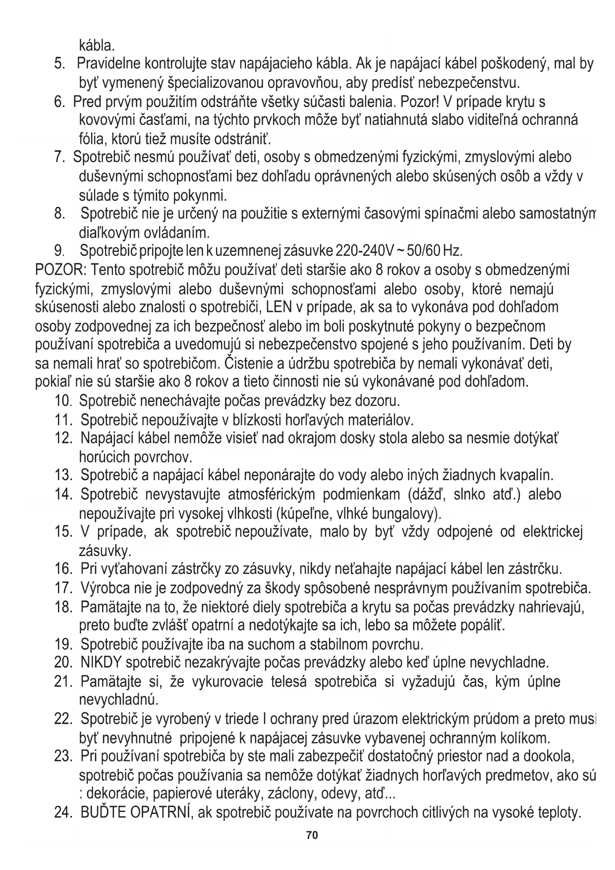 9. Spotrebič pripojte len k uzemnenej zásuvke 220-240V ~ 50/60 Hz.
