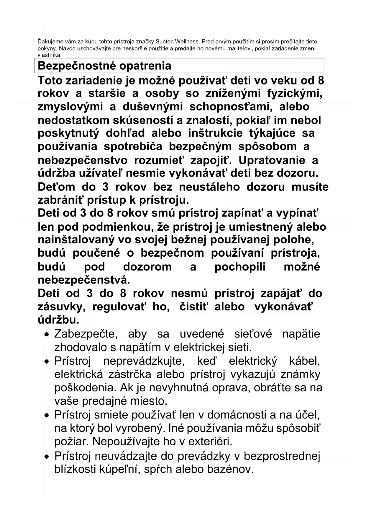 Heat Screen 1800 SUNTEC WELLNESS GMBH / HOLZSTRASSE 2 / 40 221 DÜSSELDORF / GERMANYSK Heat Screen 1800 chocolate/bordeaux/pearl PTC Teplovzdušný ventilátor Návod na použitieĎakujeme vám za kúpu tohto prístroja značky Suntec Wellness. Pred prvým použitím si prosím prečítajte tieto pokyny. Návod uschovávajte pre neskoršie použitie a predajte ho novému majiteľovi, pokiaľ zariadenie zmení vlastníka. Bezpečnostné opatrenia Toto zariadenie je možné používať deti vo veku od 8 rokov a staršie a osoby so zníženými fyzickými, zmyslovými a duševnými schopnosťami, alebo nedostatkom skúseností a znalostí, pokiaľ im nebol poskytnutý dohľad alebo inštrukcie týkajúce sa používania spotrebiča bezpečným spôsobom a nebezpečenstvo rozumieť zapojiť. Upratovanie a údržba užívateľ nesmie vykonávať deti bez dozoru. Deťom do 3 rokov bez neustáleho dozoru musíte zabrániť prístup k prístroju. Deti od 3 do 8 rokov smú prístroj zapínať a vypínať len pod podmienkou, že prístroj je umiestnený alebo nainštalovaný vo svojej bežnej používanej polohe, budú poučené o bezpečnom používaní prístroja, budú pod dozorom a pochopili možné nebezpečenstvá. Deti od 3 do 8 rokov nesmú prístroj zapájať do zásuvky, regulovať ho, čistiť alebo vykonávať údržbu.