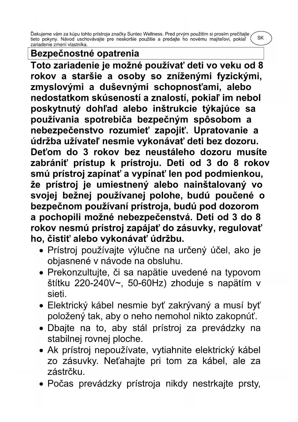 CoolBreeze SUNTEC WELLNESS GMBH / HOLZSTRASSE 2 / 40 221 DÜSSELDORF / GERMANYĎakujeme vám za kúpu tohto prístroja značky Suntec Wellness. Pred prvým použitím si prosím prečítajte tieto pokyny. Návod uschovávajte pre neskoršie použitie a predajte ho novému majiteľovi, pokiaľ zariadenie zmení vlastníka. Bezpečnostné opatrenia Toto zariadenie je možné používať deti vo veku od 8 rokov a staršie a osoby so zníženými fyzickými, zmyslovými a duševnými schopnosťami, alebo nedostatkom skúseností a znalostí, pokiaľ im nebol poskytnutý dohľad alebo inštrukcie týkajúce sa používania spotrebiča bezpečným spôsobom a nebezpečenstvo rozumieť zapojiť. Upratovanie a údržba užívateľ nesmie vykonávať deti bez dozoru. Deťom do 3 rokov bez neustáleho dozoru musíte zabrániť prístup k prístroju. Deti od 3 do 8 rokov smú prístroj zapínať a vypínať len pod podmienkou, že prístroj je umiestnený alebo nainštalovaný vo svojej bežnej používanej polohe, budú poučené o bezpečnom používaní prístroja, budú pod dozorom a pochopili možné nebezpečenstvá. Deti od 3 do 8 rokov nesmú prístroj zapájať do zásuvky, regulovať ho, čistiť alebo vykonávať údržbu.