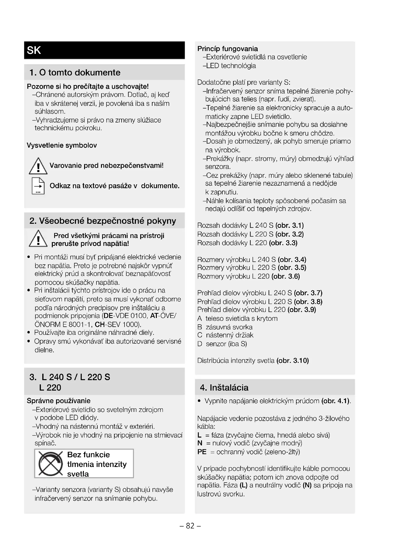 L 220 Správne používanie – Exteriérové svietidlo so svetelným zdrojom v podobe LED diódy. – Vhodný na nástennú montáž v exteriéri. – Výrobok nie je vhodný na pripojenie na stmievací spínač. Bez funkcie tlmenia intenzity svetla – Varianty senzora (varianty S) obsahujú navyše infračervený senzor na snímanie pohybu. Princíp fungovania – Exteriérové svietidlá na osvetlenie – LED technológia Dodatočne platí pre varianty S: – Infračervený senzor sníma tepelné žiarenie pohy- bujúcich sa telies (napr. ľudí, zvierat). – Tepelné žiarenie sa elektronicky spracuje a auto- maticky zapne LED svietidlo. – Najbezpečnejšie snímanie pohybu sa dosiahne montážou výrobku bočne ksmeru chôdze. – Dosah je obmedzený, ak pohyb smeruje priamo na výrobok. – Prekážky (napr. stromy, múry) obmedzujú výhľad senzora. – Cez prekážky (napr. múry alebo sklenené tabule) sa tepelné žiarenie nezaznamená a nedôjde kzapnutiu. – Náhle kolísania teploty spôsobené počasím sa nedajú odlíšiť od tepelných zdrojov. Rozsah dodávky L 240 S (obr. 3.1) Rozsah dodávky L 220 S (obr. 3.2) Rozsah dodávky L 220 (obr. 3.3) Rozmery výrobku L 240 S (obr. 3.4) Rozmery výrobku L 220 S (obr. 3.5) Rozmery výrobku L 220 (obr. 3.6) Prehľad dielov výrobku L 240 S (obr. 3.7) Prehľad dielov výrobku L 220 S (obr. 3.8) Prehľad dielov výrobku L 220 (obr. 3.9) A teleso svietidla skrytom B zásuvná svorka C nástenný držiak D senzor (iba S) Distribúcia intenzity svetla (obr. 3.10)