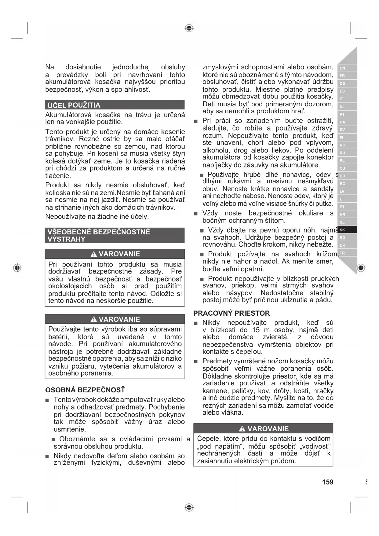 ■ Tento výrobok dokáže amputovať ruky alebo nohy a odhadzovať predmety. Pochybenie pri dodržiavaní bezpečnostných pokynov tak môže spôsobiť vážny úraz alebo usmrtenie. ■ Oboznámte sa s ovládacími prvkami a správnou obsluhou produktu. ■ Nikdy nedovoľte deťom alebo osobám so zníženými fyzickými, duševnými alebo zmyslovými schopnosťami alebo osobám, ktoré nie sú oboznámené s týmto návodom, obsluhovať, čistiť alebo vykonávať údržbu tohto produktu. Miestne platné predpisy môžu obmedzovať dobu použitia kosačky. Deti musia byť pod primeraným dozorom, aby sa nemohli s produktom hrať. ■ Pri práci so zariadením buďte ostražití, sledujte, čo robíte a používajte zdravý rozum. Nepoužívajte tento produkt, keď ste unavení, chorí alebo pod vplyvom, alkoholu, drog alebo liekov. Po oddelení akumulátora od kosačky zapojte konektor nabíjačky do zásuvky na akumulátore. ■ Používajte hrubé dlhé nohavice, odev s dlhými rukávmi a masívnu nešmykľavú obuv. Nenoste krátke nohavice a sandály ani nechoďte naboso. Nenoste odev, ktorý je voľný alebo má voľne visiace šnúrky či pútka. ■ Vždy noste bezpečnostné okuliare s bočným ochranným štítom. ■ Vždy dbajte na pevnú oporu nôh, najmä na svahoch. Udržujte bezpečný postoj a rovnováhu. Choďte krokom, nikdy nebežte. ■ Produkt požívajte na svahoch krížom, nikdy nie nahor a nadol. Ak meníte smer, buďte veľmi opatrní. ■ Produkt nepoužívajte v blízkosti prudkých svahov, priekop, veľmi strmých svahov alebo násypov. Nedostatočne stabilný postoj môže byť príčinou ukĺznutia a pádu. PRACOVNÝ PRIEST