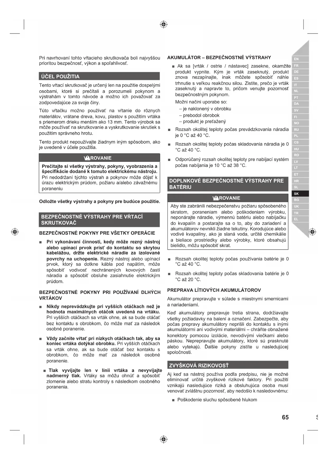■ Ak sa [vrták / ostrie / nástavec] zasekne, okamžite produkt vypnite. Kým je vrták zaseknutý, produkt znova nezapínajte, inak môžete spôsobiť náhle trhnutie s veľkou reakčnou silou. Zistite, prečo je vrták zaseknutý a napravte to, pričom venujte pozornosť bezpečnostným pokynom. Možni načini uporabe so: – je naklonený v obrobku – prebodol obrobok – produkt je preťažený ■ Rozsah okolitej teploty počas prevádzkovania náradia je 0 °C až 40 °C. ■ Rozsah okolitej teploty počas skladovania náradia je 0 °C až 40 °C. ■ Odporúčaný rozsah okolitej teploty pre nabíjací systém počas nabíjania je 10 °C až 38 °C.