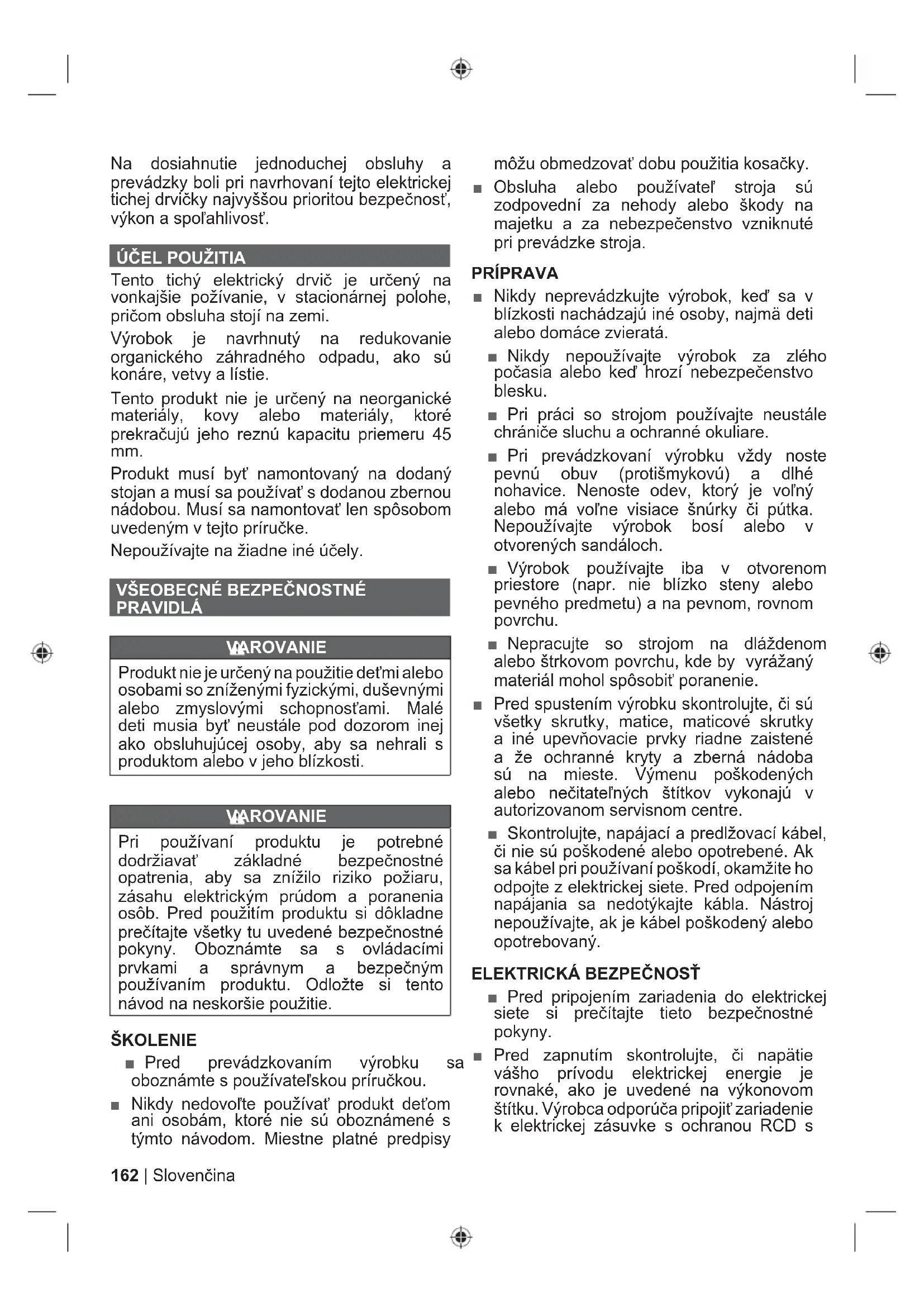 PRAVIDLÁ VAROVANIE Produkt nie je určený na použitie deťmi alebo osobami so zníženými fyzickými, duševnými alebo zmyslovými schopnosťami. Malé deti musia byť neustále pod dozorom inej ako obsluhujúcej osoby, aby sa nehrali s produktom alebo v jeho blízkosti. VAROVANIE Pri používaní produktu je potrebné dodržiavať základné bezpečnostné opatrenia, aby sa znížilo riziko požiaru, zásahu elektrickým prúdom a poranenia osôb. Pred použitím produktu si dôkladne prečítajte všetky tu uvedené bezpečnostné pokyny. Oboznámte sa s ovládacími prvkami a správnym a bezpečným používaním produktu. Odložte si tento návod na neskoršie použitie. ŠKOLENIE ■ Pred prevádzkovaním výrobku sa oboznámte s používateľskou príručkou. ■ Nikdy nedovoľte používať produkt deťom ani osobám, ktoré nie sú oboznámené s týmto návodom. Miestne platné predpisy môžu obmedzovať dobu použitia kosačky. ■ Obsluha alebo používateľ stroja sú zodpovední za nehody alebo škody na majetku a za nebezpečenstvo vzniknuté pri prevádzke stroja. PRÍPRAVA ■ Nikdy neprevádzkujte výrobok, keď sa v blízkosti nachádzajú iné osoby, najmä deti alebo domáce zvieratá. ■ Nikdy nepoužívajte výrobok za zlého počasia alebo keď hrozí nebezpečenstvo blesku. ■ Pri práci so strojom používajte neustále chrániče sluchu a ochranné okuliare. ■ Pri prevádzkovaní výrobku vždy noste pevnú obuv (protišmykovú) a dlhé nohavice. Nenoste odev, ktorý je voľný alebo má voľne visiace šnúrky či pútka. Nepoužívajte výrobok bosí alebo v otvorených sandáloch. ■ Výrobok používajte iba v otvorenom priestore (napr. nie blízko steny alebo pevného predmetu) a na pevnom, rovnom povrchu. ■ Nepracujte so strojom na dláždenom alebo štrkovom povrchu, kde by vyrážaný materiál mohol spôsobiť poranenie. ■ Pred spustením výrobku skontrolujte, či sú všetky skrutky, matice, maticové skrutky a iné upevňovacie prvky riadne zaistené a že ochranné kryty a zberná nádoba sú na mieste. Výmenu poškodených alebo nečitateľných štítkov vykonajú v autorizovanom servisnom centre. ■ Skontrolujte, napájací a predlžovací kábel, či nie sú poškodené alebo opotrebené. Ak sa kábel pri používaní poškodí, okamžite ho odpojte z elektrickej siete. Pred odpojením napájania sa nedotýkajte kábla. Nástroj nepoužívajte, ak je kábel poškodený alebo opotrebovaný.