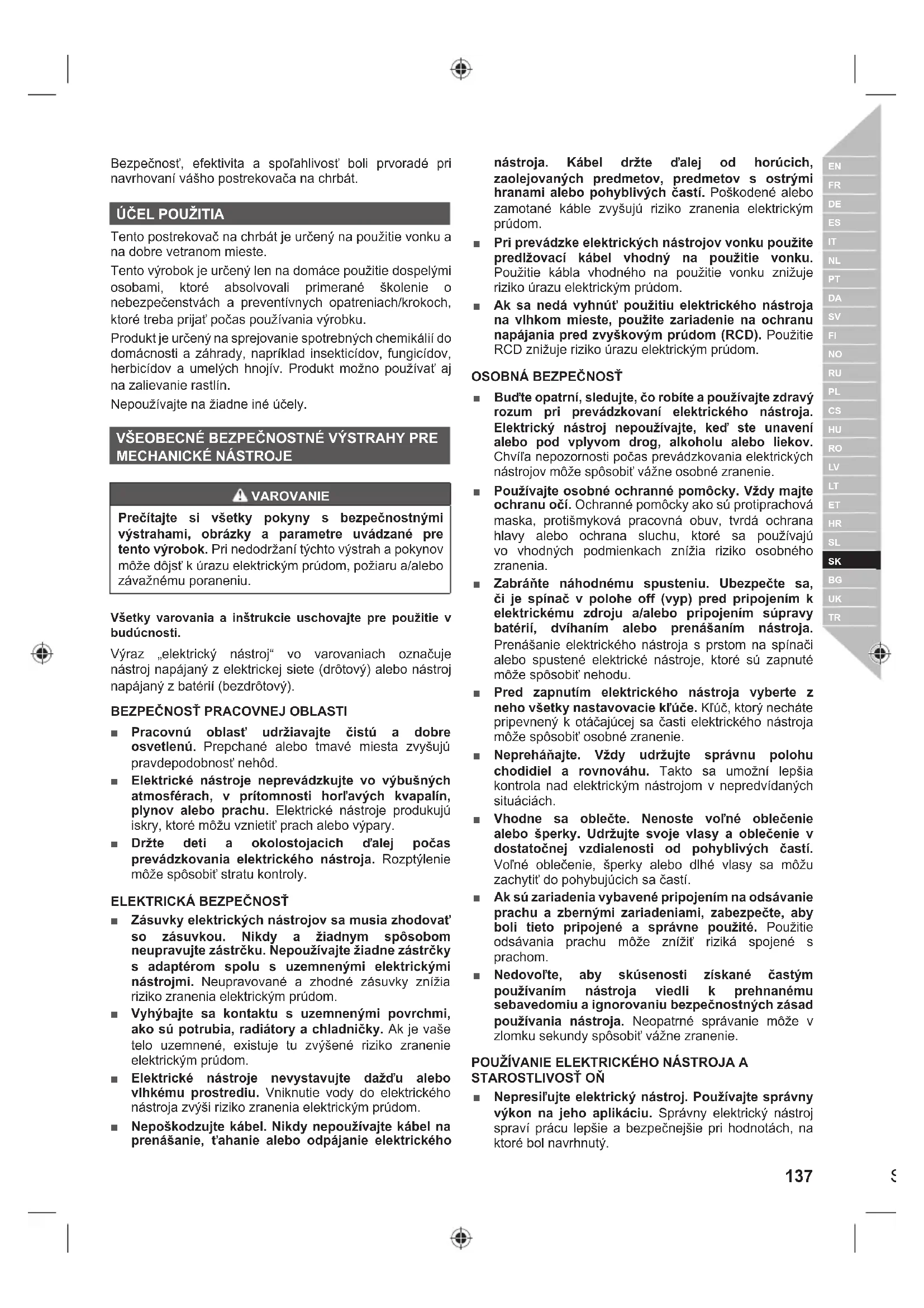Tento postrekovač na chrbát je určený na použitie vonku a na dobre vetranom mieste. Tento výrobok je určený len na domáce použitie dospelými osobami, ktoré absolvovali primerané školenie o nebezpečenstvách a preventívnych opatreniach/krokoch, ktoré treba prijať počas používania výrobku. Produkt je určený na sprejovanie spotrebných chemikálií do domácnosti a záhrady, napríklad insekticídov, fungicídov, herbicídov a umelých hnojív. Produkt možno používať aj na zalievanie rastlín. Nepoužívajte na žiadne iné účely. VŠEOBECNÉ BEZPEČNOSTNÉ VÝSTRAHY PRE