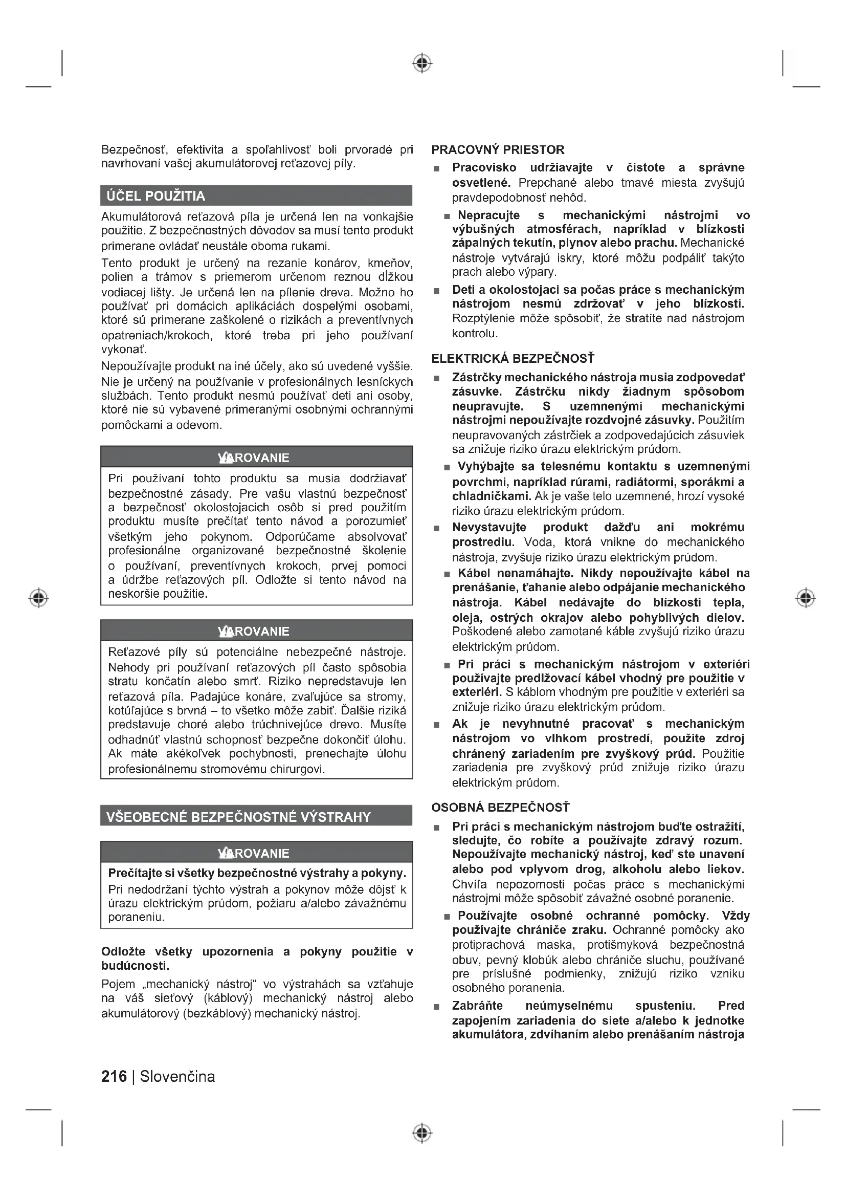 VAROVANIE Prečítajte si všetky bezpečnostné výstrahy a pokyny. Pri nedodržaní týchto výstrah a pokynov môže dôjsť k úrazu elektrickým prúdom, požiaru a/alebo závažnému poraneniu. Odložte všetky upozornenia a pokyny použitie v budúcnosti. Pojem „mechanický nástroj“ vo výstrahách sa vzťahuje na váš sieťový (káblový) mechanický nástroj alebo akumulátorový (bezkáblový) mechanický nástroj. PRACOVNÝ PRIESTOR ■ Pracovisko udržiavajte v čistote a správne osvetlené. Prepchané alebo tmavé miesta zvyšujú pravdepodobnosť nehôd. ■ Nepracujte s mechanickými nástrojmi vo výbušných atmosférach, napríklad v blízkosti zápalných tekutín, plynov alebo prachu. Mechanické nástroje vytvárajú iskry, ktoré môžu podpáliť takýto prach alebo výpary. ■ Deti a okolostojaci sa počas práce s mechanickým nástrojom nesmú zdržovať v jeho blízkosti. Rozptýlenie môže spôsobiť, že stratíte nad nástrojom kontrolu.