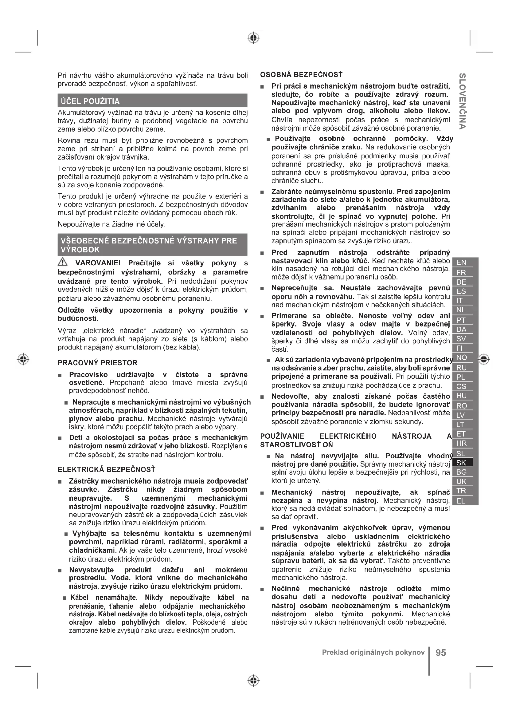 Výstražná značka Pred používaním výrobku si prečítajte a pochopte všetky pokyny. Dodržujte všetky výstrahy a bezpečnostné pokyny. Používajte chrániče zraku a sluchu. Pozor na vymrštené alebo odletujúce objekty. Zabezpečte, aby všetci okolostojaci, hlavne deti a zvieratá, boli aspoň 15 m od plochy používania výrobku. Nepoužívajte kovové ostria na produkte. Nevystavujte dažďu ani nepoužívajte vo vlhkom prostredí. Vyberte sadu batérií pred vykonávaním akýchkoľvek prác na výrobku. Ruky držte v bezpečnej vzdialenosti od čepelí.
