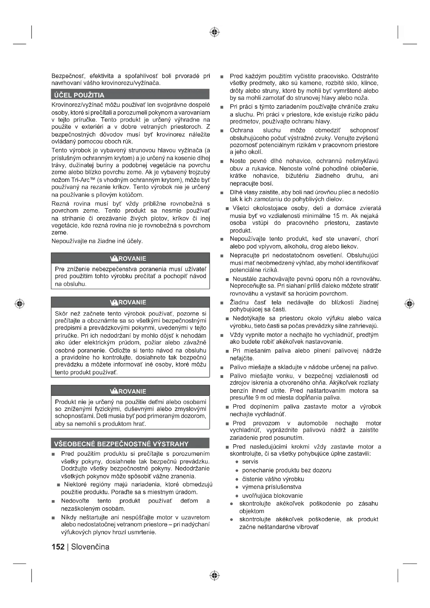 Krovinorez/vyžínač môžu používať len svojprávne dospelé osoby, ktoré si prečítali a porozumeli pokynom a varovaniam v tejto príručke. Tento produkt je určený výhradne na použite v exteriéri a v dobre vetraných priestoroch. Z bezpečnostných dôvodov musí byť krovinorez náležite ovládaný pomocou oboch rúk. Tento výrobok je vybavený strunovou hlavou vyžínača (a príslušným ochranným krytom) a je určený na kosenie dlhej trávy, dužinatej buriny a podobnej vegetácie na povrchu zeme alebo blízko povrchu zeme. Ak je vybavený trojzubý nožom Tri-Arc™ (s vhodným ochranným krytom), môže byť používaný na rezanie kríkov. Tento výrobok nie je určený na používanie s pílovým kotúčom. Rezná rovina musí byť vždy približne rovnobežná s povrchom zeme. Tento produkt sa nesmie používať na strihanie či orezávanie živých plotov, kríkov či inej vegetácie, kde rezná rovina nie je rovnobežná s povrchom zeme. Nepoužívajte na žiadne iné účely. VAROVANIE Pre zníženie nebezpečenstva poranenia musí užívateľ pred použitím tohto výrobku prečítať a pochopiť návod na obsluhu. VAROVANIE Skôr než začnete tento výrobok používať, pozorne si prečítajte a oboznámte sa so všetkými bezpečnostnými predpismi a prevádzkovými pokynmi, uvedenými v tejto príručke. Pri ich nedodržaní by mohlo dôjsť k nehodám ako úder elektrickým prúdom, požiar alebo závažné osobné poranenie. Odložte si tento návod na obsluhu a pravidelne ho kontrolujte, dosiahnete tak bezpečnú prevádzku a môžete informovať iné osoby, ktoré môžu tento produkt používať. VAROVANIE Produkt nie je určený na použitie deťmi alebo osobami so zníženými fyzickými, duševnými alebo zmyslovými schopnosťami. Deti musia byť pod primeraným dozorom, aby sa nemohli s produktom hrať.