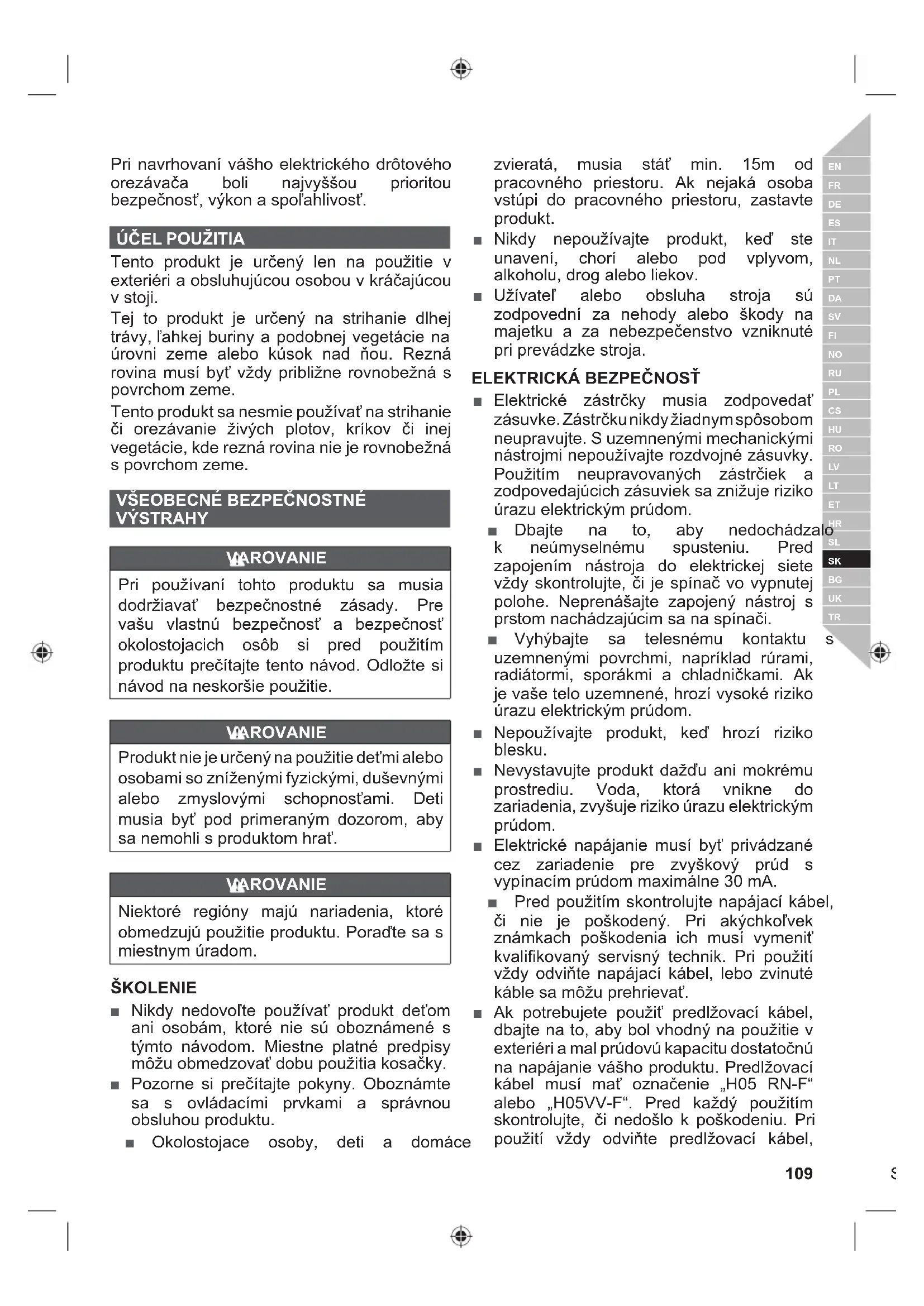 Ŷ Pri práci s týmto zariadením používajte chrániþe zraku a sluchu. Pri práci v priestore, kde existuje riziko pádu predmetov, používajte ochranu hlavy. Ŷ Tepelná ochrana môže obmedziĢ schopnosĢ obsluhujúceho poþuĢ výstražné zvuky, venovaĢ primeranú pozornosĢ nebezpeþenstvám v okolí pracoviska i na Ėom. Ŷ Noste hrubé a dlhé nohavice, topánky a rukavice. Nenoste voĐné pohodlné obleþenie, krátke nohavice, bižutériu žiadneho druhu, ani nepracujte bosí. Ŷ Dlhé vlasy zaistite, aby boli nad úrovĖou pliec a nedošlo tak k ich zamotaniu do pohyblivých dielov. Ŷ Pred použitím a po každom náraze skontrolujte, þi nie sú nejaké diely poškodené. Chybný spínaþ þi akýkoĐvek iný diel, ktorý je poškodený alebo opotrebovaný, je potrebné náležite opraviĢ alebo vymeniĢ v autorizovanom servisnom zariadení. Ŷ Skontrolujte, þi je rezný nástavec správne namontovaný a bezpeþne upnutý. Ŷ Nikdy nepoužívajte produkt, kým nie sú správne a bezpeþne nasadené všetky ochranné kryty, odchyĐovaþe a rukoväte. Ŷ Berte ohĐad na prostredie, v ktorom pracujete. Z pracoviska odstráĖte všetky drôty, paliþky, drievka, kamene a sutinu, ktoré by sa mohli pri zásahu nožom vymrštiĢ. DRÔTOVÝ OREZÁVAý – BEZPEýNOSTNÉ VÝSTRAHY Ŷ Produkt nikdy nedovoĐte používaĢ deĢom alebo osobám neoboznámeným s návodom na použitie. Ŷ Produkt používajte za denného svetla alebo pri dobrom umelom osvetlení. Ŷ Nepoužívajte na mokrej tráve. Ŷ Pri používaní produktu nekráþajte dozadu. Ŷ Udržujte bezpeþný postoj a rovnováhu. NepreceĖujte sa. PreceĖovanie sa môže spôsobiĢ stratu rovnováhy. Na svahoch vždy dbajte na pevnú oporu nôh a vždy kráþajte, nebežte. Ŷ Okolostojace osoby, deti a domáce zvieratá, musia stáĢ min. 15 m od pracovného priestoru. Ŷ Rezný nástavec udržiavajte pod úrovĖou pásu. Ŷ Nikdy nepoužívajte produkt, ktorý má poškodené kryty alebo keć kryty nie sú nasadené. Ŷ Nikdy nenasadzujte kovový náhradný drôt. Ŷ Neustále, najmä pri zapínaní motora, držte ruky a nohy mimo dosahu rezných prostriedkov. Ŷ Pozor, rezné prvky pokraþujú v otáþaní aj po vypnutí motora. Ŷ Pozor na objekty vymrštené rezným nástrojom. Pred zaþatím práce odstráĖte z pracoviska kamienky, štrk a ostatné cudzie predmety. Do rezných zariadení sa môžu zamotaĢ vodiþe alebo vlákna. Ŷ Vypnite a odpojte z elektrickej siete, pred: Ɣ servis Ɣ ponechanie produktu bez dozoru111 Slovenþina |