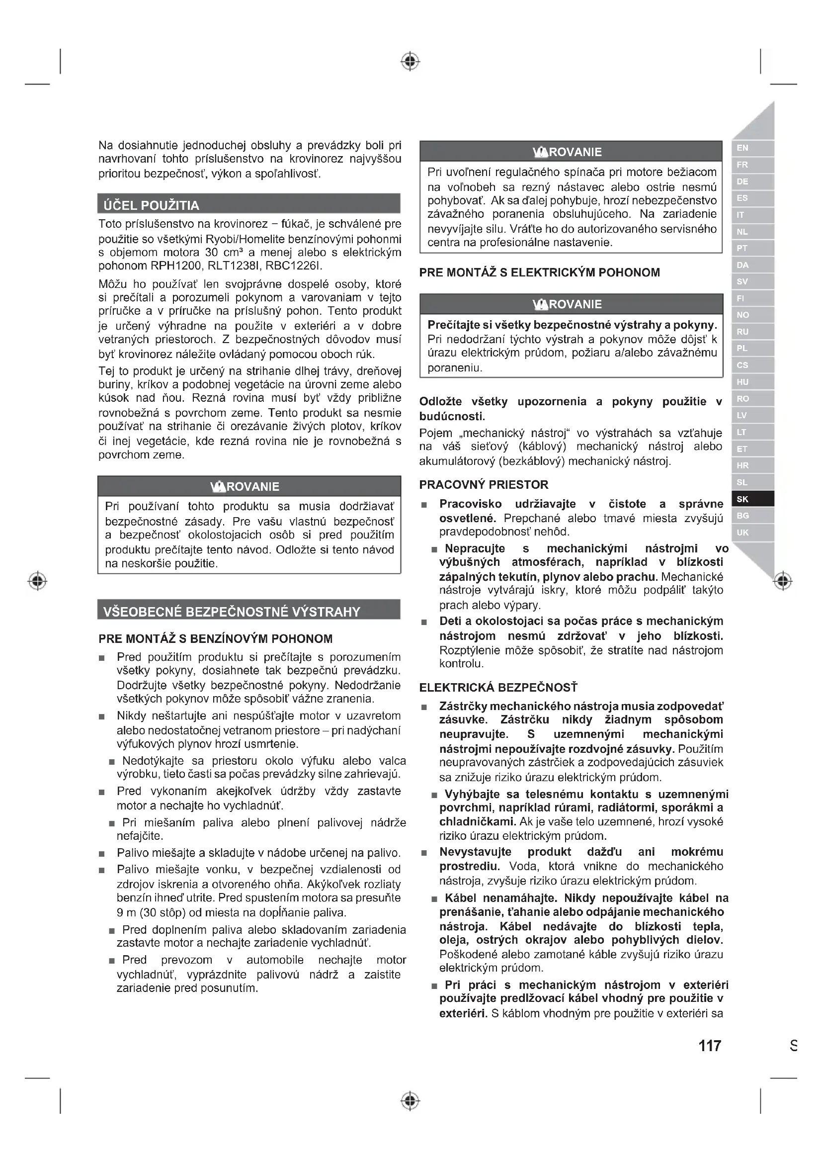 Toto príslušenstvo na krovinorez − fúkač, je schválené pre použitie so všetkými Ryobi/Homelite benzínovými pohonmi s objemom motora 30 cm³ a menej alebo s elektrickým pohonom RPH1200, RLT1238I, RBC1226I. Môžu ho používať len svojprávne dospelé osoby, ktoré si prečítali a porozumeli pokynom a varovaniam v tejto príručke a v príručke na príslušný pohon. Tento produkt je určený výhradne na použite v exteriéri a v dobre vetraných priestoroch. Z bezpečnostných dôvodov musí byť krovinorez náležite ovládaný pomocou oboch rúk. Tej to produkt je určený na strihanie dlhej trávy, dreňovej buriny, kríkov a podobnej vegetácie na úrovni zeme alebo kúsok nad ňou. Rezná rovina musí byť vždy približne rovnobežná s povrchom zeme. Tento produkt sa nesmie používať na strihanie či orezávanie živých plotov, kríkov či inej vegetácie, kde rezná rovina nie je rovnobežná s povrchom zeme. VAROVANIE Pri používaní tohto produktu sa musia dodržiavať bezpečnostné zásady. Pre vašu vlastnú bezpečnosť a bezpečnosť okolostojacich osôb si pred použitím produktu prečítajte tento návod. Odložte si tento návod na neskoršie použitie.