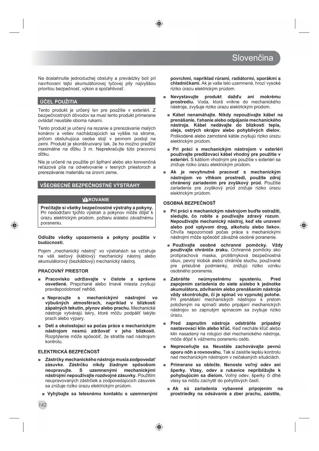 aby boli správne pripojené a primerane sa používali. Pri použití týchto prostriedkov sa znižujú riziká pochádzajúce z prachu. POUŽÍVANIE ELEKTRICKÉHO NÁSTROJA A STA- ROSTLIVOSŤ OŇ ■ Na nástroj nevyvíjajte silu. Používajte vhodný nástroj pre dané použitie. Správny mechanický nástroj splní svoju úlohu lepšie a bezpečnejšie pri rýchlosti, na ktorú je určený. ■ Mechanický nástroj nepoužívajte, ak spínač nezapína a nevypína nástroj. Mechanický nástroj, ktorý sa nedá ovládať spínačom, je nebezpečný a musí sa dať opraviť. ■ Pred vykonaním akýchkoľvek úprav, výmene príslušenstva alebo odložením mechanického nástroja odpojte zástrčku zo sieťovej zásuvky a/ alebo jednotky akumulátora. Takéto preventívne opatrenie znižuje riziko neúmyselného spustenia mechanického nástroja. ■ Nečinné mechanické nástroje odložte mimo dosahu detí a nedovoľte používať mechanický nástroj osobám neoboznámeným s mechanickým nástrojom alebo týmito pokynmi. Mechanické nástroje sú v rukách netrénovaných osôb nebezpečné. ■ Na mechanických nástrojoch vykonávajte údržbu. Skontrolujte, či pohyblivé diely nie sú nesprávne nastavené alebo zablokované, či niektoré diely nie sú poškodené, ako aj akýkoľvek iný stav, ktorý by mohol ovplyvniť činnosť mechanického nástroja. V prípade poškodenia nechajte mechanický nástroj pre použitím opraviť. Veľké množstvo nehôd je spôsobených nedostatočnou údržbou mechanických nástrojov. ■ Rezacie nástroje udržiavajte ostré a v čistote. Správne udržiavané rezacie nástroje s ostrými ostriami sa menej pravdepodobne zaseknú a ľahšie sa ovládajú. ■ Mechanický nástroj, príslušenstvo a vrtáky a pod., používajte v súlade s týmto návodom, pričom berte do úvahy pracovné podmienky a úlohu, ktorú chcete vykonať. Pri používaní mechanického nástroja na iné ako určené činnosti môže dôjsť k nebezpečným situáciám. OPRAVY ■ Servis mechanického nástroja prenechajte kvalifikovanému servisnému pracovníkovi s použitím len identických náhradných dielov. Takto zachováte bezpečnosť mechanického nástroja. ĎALŠIE VŠEOBECNÉ BEZPEČNOSTNÉ VÝSTRAHY ■ Niektoré regióny majú nariadenia, ktoré obmedzujú použitie produktu. Poraďte sa s miestnym úradom. ■ Produkt nikdy nedovoľte používať deťom alebo osobám neoboznámeným s návodom na použitie. Miestne platné predpisy môžu obmedzovať dobu použitia kosačky. ■ Pred každým použitím skontrolujte, či všetky ovládacie prvky a bezpečnostné zariadenia fungujú správne. Produkt nepoužívajte, ak hlavný spínač nevypína motor. ■ Pri práci s produktom používajte kompletné chrániče zraku a sluchu, pevné a odolné rukavice a ochranu hlavy. V prašnom prostredí použite tvárovú masku. ■ Nenoste oblečenie voľného strihu, krátke nohavice, ani bižutériu žiadneho druhu. ■ Dlhé vlasy zaistite, aby boli nad úrovňou pliec a nedošlo tak k ich zamotaniu do pohyblivých dielov. ■ Pozor na vymršťované predmety – všetky okolostojace osoby, deti a domáce zvieratá musia stáť minimálne 15 m od pracoviska. ■ Nepracujte pri nedostatočnom osvetlení. Obsluhujúci musí mať jasný výhľad na pracovný priestor, aby mohol identifikovať potenciálne nebezpečenstvo. ■ Použitie ochrany sluchu znižuje schopnosť počuť zvukové výstrahy (výkriky alebo alarmy). Operátor musí dávať zvlášť pozor, čo sa deje v pracovnej oblasti. ■ Pri používaní podobných nástrojov v blízkosti sa zvyšuje riziko poranenia sluchu a potenciál pre ostatné osoby, ktoré vstúpia do pracovného priestoru. ■ Udržujte bezpečný postoj a rovnováhu. Nepreceňujte sa. Pri siahaní príliš ďaleko môžete stratiť rovnováhu a zvýšite riziko spätného nárazu. ■ Žiadnu časť tela nedávajte do blízkosti žiadnej pohybujúcej sa časti. ■ Pred každým použitím nástroj skontrolujte. Skontrolujte správnu činnosť všetkých ovládacích prvkov. Skontrolujte, či nie sú uvoľnené napínadlá a či sú všetky kryty a rukoväte správne a bezpečne nasadené. Pred použitím vymeňte všetky poškodené diely. ■ Zariadenie žiadnym spôsobom neupravujte ani nepoužívajte diely či príslušenstvo, ktoré neodporúča výrobca. ■ Dbajte na to, aby vaša blízka znalosť tohto zariadenia nespôsobila nedbalé používanie. Zapamätajte si, že aj v ľahostajnosti aj zlomok sekundy môže viesť k vážnym zraneniam. ■ Rukoväte a úchopné povrchy udržiavajte suché, čisté a bez zvyškov oleja či maziva. Klzké rukoväte a úchopné povrchy neumožňujú bezpečnú manipuláciu a ovládanie nástroja v neočakávaných situáciách. ■ Používajte len predlžovací kábel chránený proti vplyvom počasia. Pred každý použitím skontrolujte predlžovací kábel, či nedošlo k poškodeniu. Pri použití vždy odviňte predlžovací kábel, lebo zvinuté káble sa môžu prehrievať. Poškodené predlžovacie káble sa nesmú opravovať, ale vymeniť za ekvivalentný typ.Slovenčina