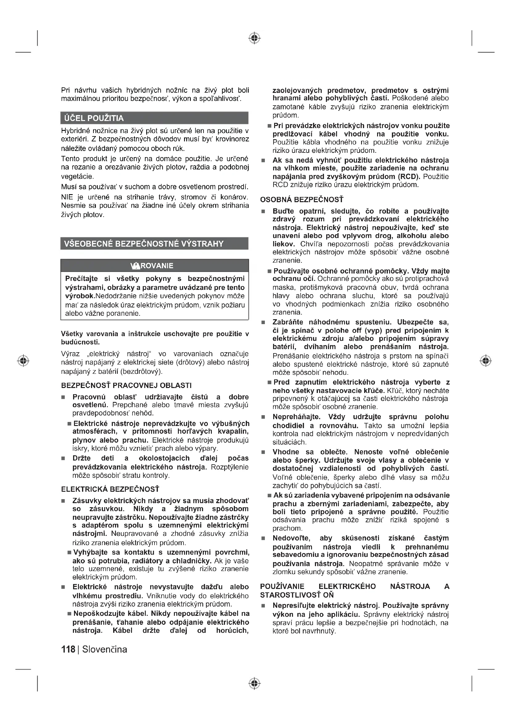 ■ Telo udržiavajte mimo dosahu rezného ostria. Neodstraňujte odstrihnutý materiál ani nedržte strihaný materiál, keď sa ostria pohybujú. Pri čistení zaseknutého materiálu musí byť spínač vypnutý. Chvíľa nepozornosti počas obsluhy produktu môže spôsobiť závažné osobné poranenie. ■ Strihač živého plotu prenášajte za rukoväť, pričom rezné ostrie je zastavené. Pre prenášaní alebo skladovaní strihača plotu vždy nasaďte kryt strihacieho zariadenia. Pri správnom zaobchádzaní so strihačom živého plotu sa znižuje pravdepodobnosť osobného poranenia rezným ostrím. ■ Elektrický nástroj držte len za izolované úchopné povrchy, lebo rezné ostrie sa môže dostať do kontaktu so skrytými vodičmi alebo vlastným káblom. Pri kontakte rezných ostrí so „živým“ vodičom by mohli byť obnažené kovové diely pod prúdom a spôsobiť obsluhujúcemu úder elektrickým prúdom. ■ Kábel udržiavajte mimo dosahu strihacej časti. Počas práce sa môže kábel skryť do raždia a náhodne prestrihnutý ostrím.