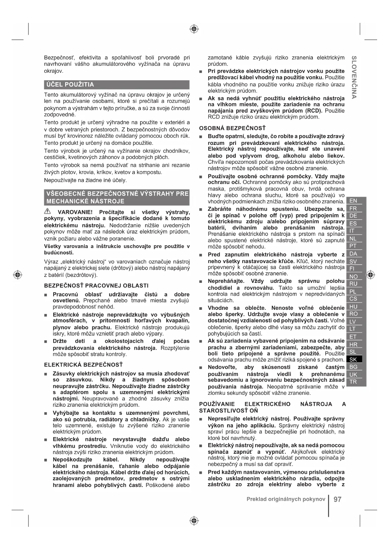 AKUMULÁTOROVÝ VYŽÍNAČ NA ÚPRAVU OKRAJOV ■ Pri používaní tohto produktu sa musia dodržiavať bezpečnostné zásady. Pre vašu vlastnú bezpečnosť a bezpečnosť okolostojacich osôb si pred použitím produktu prečítajte tento návod. Odložte si tento návod na neskoršie použitie. ■ Produkt nie je určený na použitie deťmi alebo osobami so zníženými fyzickými, duševnými alebo zmyslovými schopnosťami. Deti musia byť pod primeraným dozorom, aby sa nemohli s produktom hrať. ■ Keď sa v blízkosti nachádzajú iné osoby, najmä deti alebo domáce zvieratá, nepoužívajte nástroj. ■ Pri vyžínaní okrajov vždy používajte ochranu zraku a sluchu, odolnú obuv a dlhé nohavice. ■ Na svahoch vždy dbajte na pevnú oporu nôh. ■ Pri obracaní alebo ťahaní produktu smerom k sebe buďte mimoriadne opatrní. ■ Niektoré regióny majú nariadenia, ktoré obmedzujú použitie produktu na určité operácie. Poraďte sa s miestnym úradom. ■ Pozorne skontrolujte povrch, kde sa bude výrobok používať, a odstráňte všetky kamene, palice, drôty, kosti a iný cudzí materiál. ■ Nepoužívajte produkt v zlom počasí, najmä ak existuje riziko vzniku bleskov. ■ Produkt používajte za denného svetla alebo pri dobrom umelom osvetlení. ■ Nepoužívajte na mokrej tráve. ■ Neustále zachovávajte pevnú oporu nôh a rovnováhu. ■ Pri používaní produktu nekráčajte dozadu. ■ Choďte krokom, nikdy nebežte. ■ Počas práce musí byť vodiace koliesko vždy na zemi. Pri spúšťaní nezdvíhajte výrobok zo zeme, ak to nie je absolútne dôležité. ■ Nestrhajte na iných plochách ako pozemný trávnik. Pred prechádzaním cez iné než trávnaté povrchy a pri doprave výrobku na a z miesta úpravy okrajov skontrolujte, že sa ostrie zastavilo. ■ Nikdy nepoužívate výrobok, ak sú jeho chrániče poškodené alebo nie sú namontované v správnej polohe. ■ Neustále, najmä pri zapínaní motora, držte ruky a nohy mimo dosahu rezných prostriedkov. ■ Dávajte pozor na predmety odhadzované rezným ostrím. ■ Aby ste znížili riziko poranenia spojeného s kontaktom s pohyblivými časťami, výrobok vždy vypnite, vyberte z neho súpravu batérií a nechajte ich vychladnúť. Skontrolujte, či sa všetky pohyblivé diely úplne zastavili: