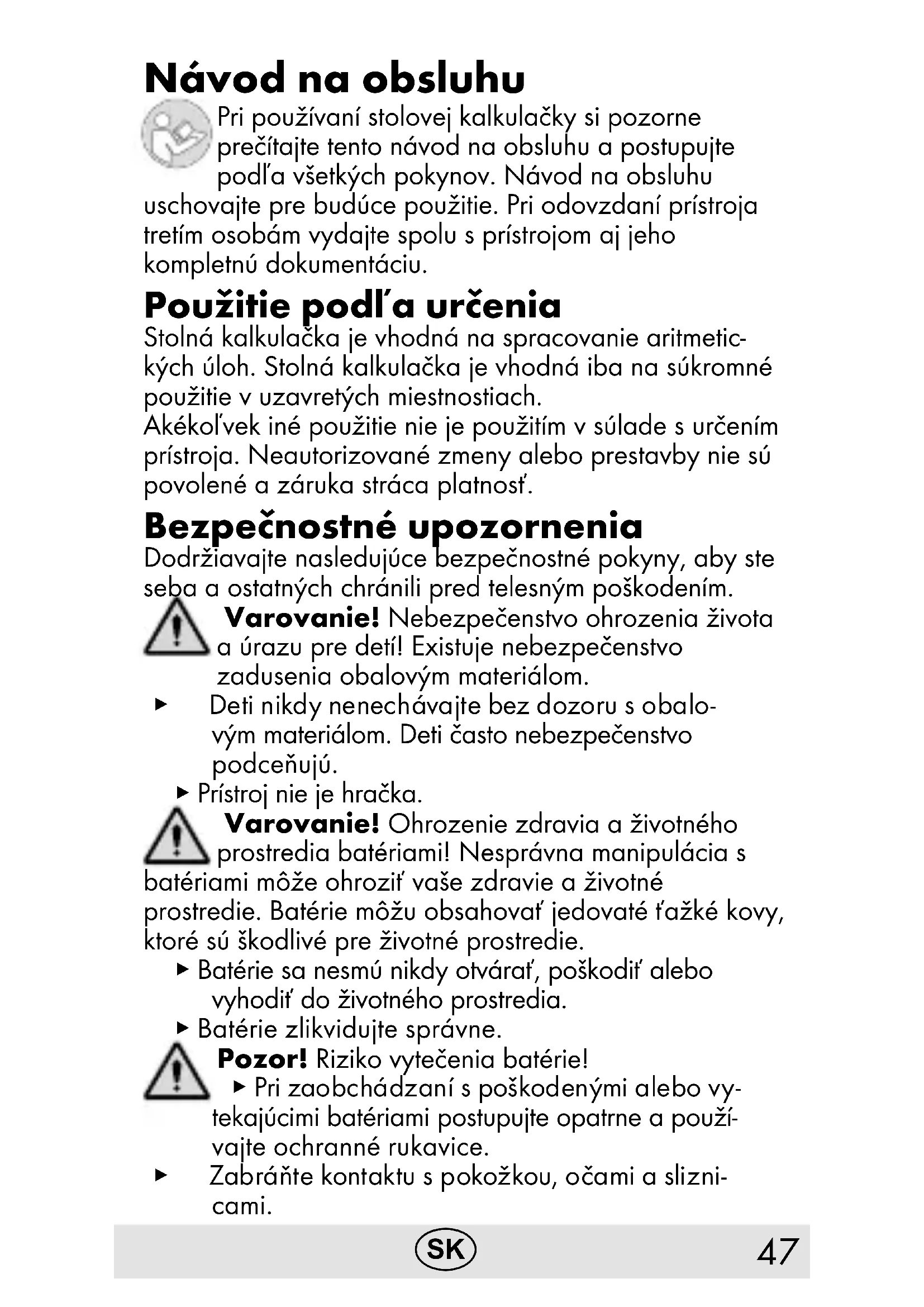 Návod na obsluhu Pri používaní stolovej kalkulačky si pozorne prečítajte tento návod na obsluhu a postupujte podľa všetkých pokynov. Návod na obsluhu uschovajte pre budúce použitie. Pri odovzdaní prístroja tretím osobám vydajte spolu s prístrojom aj jeho kompletnú dokumentáciu. Použitie podľa určenia Stolná kalkulačka je vhodná na spracovanie aritmetic- kých úloh. Stolná kalkulačka je vhodná iba na súkromné použitie v uzavretých miestnostiach. Akékoľvek iné použitie nie je použitím v súlade s určením prístroja. Neautorizované zmeny alebo prestavby nie sú povolené a záruka stráca platnosť. Bezpečnostné upozornenia Dodržiavajte nasledujúce bezpečnostné pokyny, aby ste seba a ostatných chránili pred telesným poškodením. Varovanie! Nebezpečenstvo ohrozenia života a úrazu pre detí! Existuje nebezpečenstvo zadusenia obalovým materiálom.