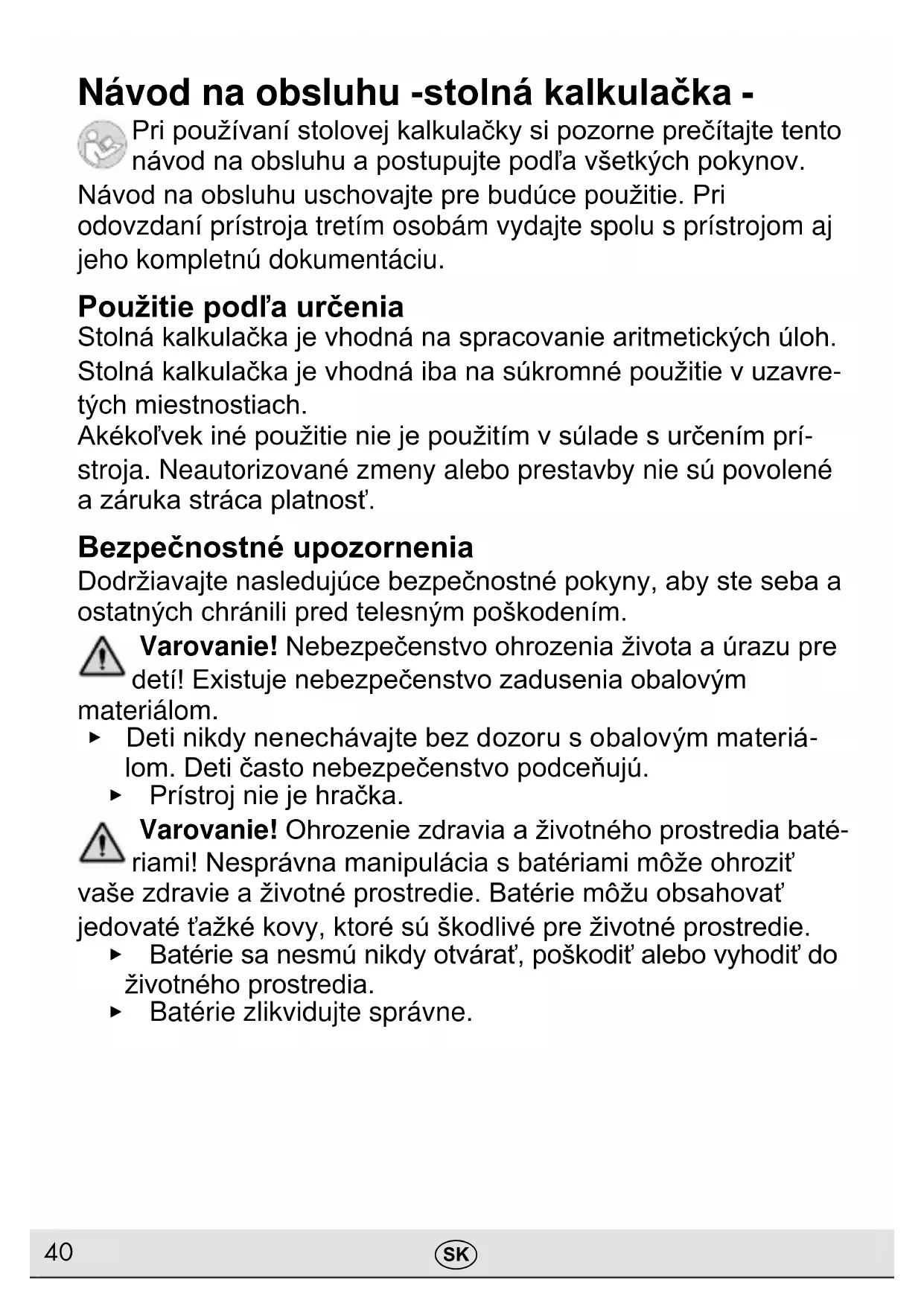 Návod na obsluhu -stolná kalkulačka - Pri používaní stolovej kalkulačky si pozorne prečítajte tento návod na obsluhu a postupujte podľa všetkých pokynov. Návod na obsluhu uschovajte pre budúce použitie. Pri odovzdaní prístroja tretím osobám vydajte spolu s prístrojom aj jeho kompletnú dokumentáciu. Použitie podľa určenia Stolná kalkulačka je vhodná na spracovanie aritmetických úloh. Stolná kalkulačka je vhodná iba na súkromné použitie v uzavre- tých miestnostiach. Akékoľvek iné použitie nie je použitím v súlade s určením prí- stroja. Neautorizované zmeny alebo prestavby nie sú povolené a záruka stráca platnosť. Bezpečnostné upozornenia Dodržiavajte nasledujúce bezpečnostné pokyny, aby ste seba a ostatných chránili pred telesným poškodením. Varovanie! Nebezpečenstvo ohrozenia života a úrazu pre detí! Existuje nebezpečenstvo zadusenia obalovým materiálom.