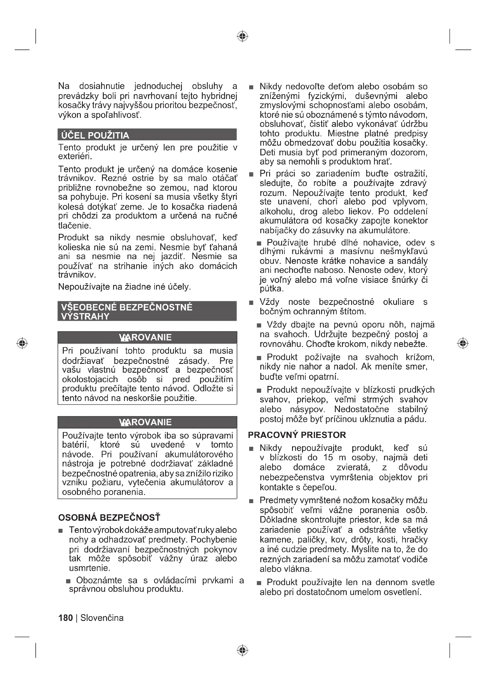 Tento produkt je určený len pre použitie v exteriéri. Tento produkt je určený na domáce kosenie trávnikov. Rezné ostrie by sa malo otáčať približne rovnobežne so zemou, nad ktorou sa pohybuje. Pri kosení sa musia všetky štyri kolesá dotýkať zeme. Je to kosačka riadená pri chôdzi za produktom a určená na ručné tlačenie. Produkt sa nikdy nesmie obsluhovať, keď kolieska nie sú na zemi. Nesmie byť ťahaná ani sa nesmie na nej jazdiť. Nesmie sa používať na strihanie iných ako domácich trávnikov. Nepoužívajte na žiadne iné účely.