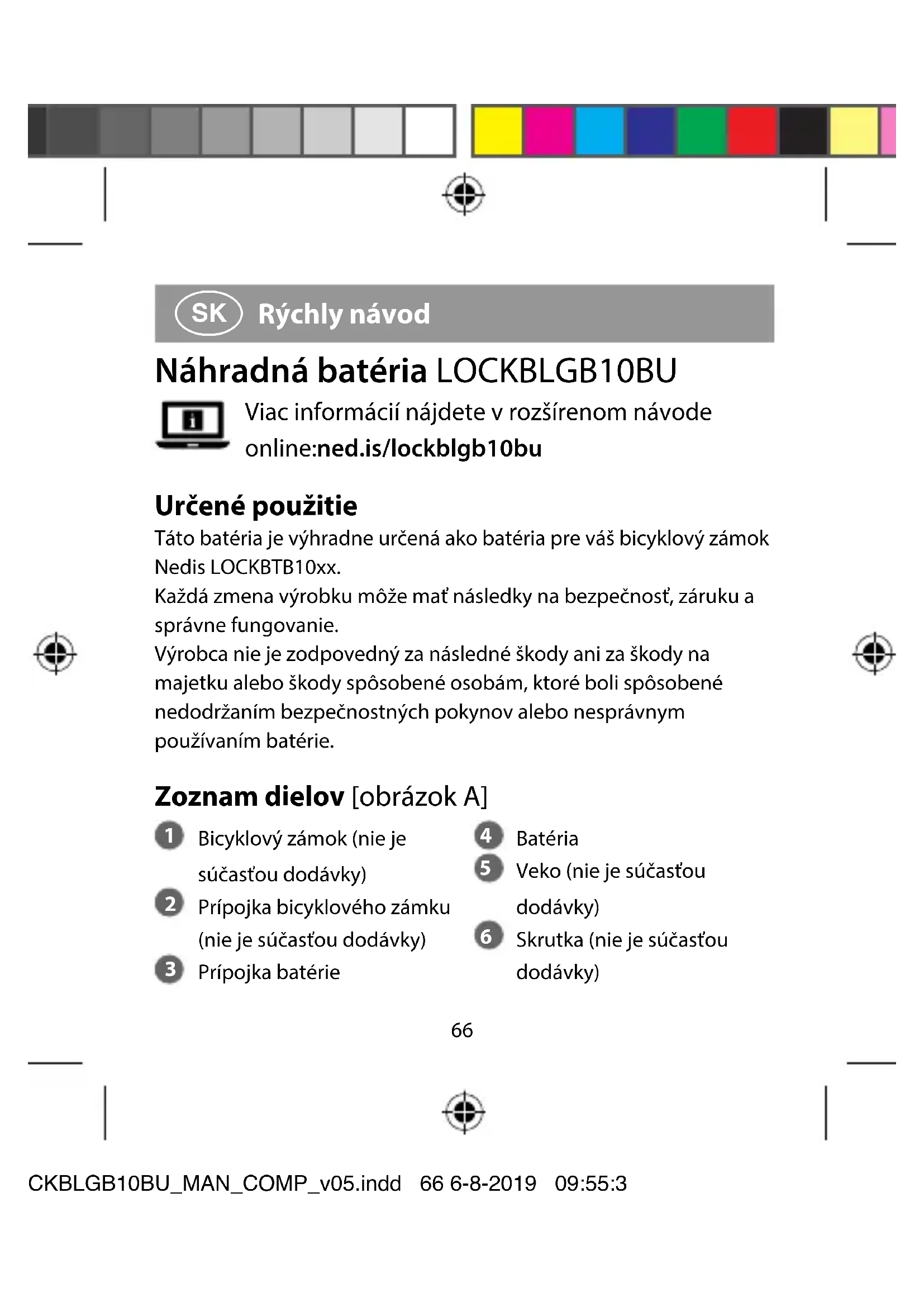 Rýchly návod Náhradná batéria LOCKBLGB10BU Viac informácií nájdete v rozšírenom návode online:ned.is/lockblgb10bu Určené použitie Táto batéria je výhradne určená ako batéria pre váš bicyklový zámok Nedis LOCKBTB10xx. Každá zmena výrobku môže mať následky na bezpečnosť, záruku a správne fungovanie. Výrobca nie je zodpovedný za následné škody ani za škody na majetku alebo škody spôsobené osobám, ktoré boli spôsobené nedodržaním bezpečnostných pokynov alebo nesprávnym používaním batérie. Zoznam dielov [obrázok A]