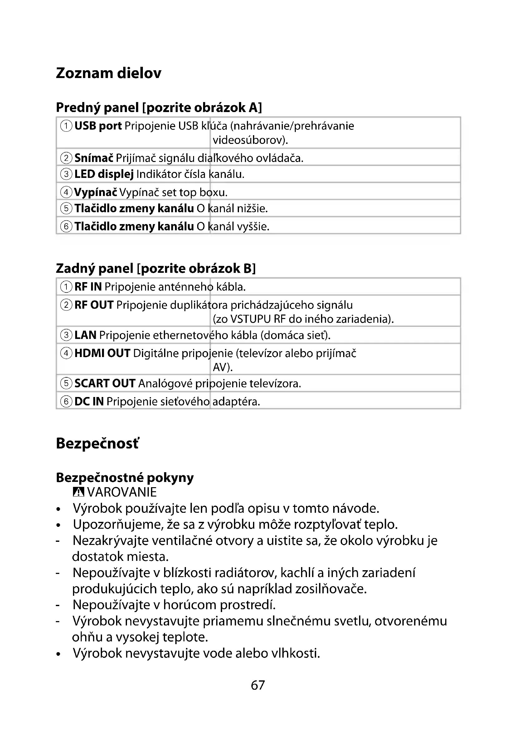 - Každá zmena výrobku môže mať následky na bezpečnosť, záruku a správne fungovanie.67 Zoznam dielov Predný panel [pozrite obrázok A]