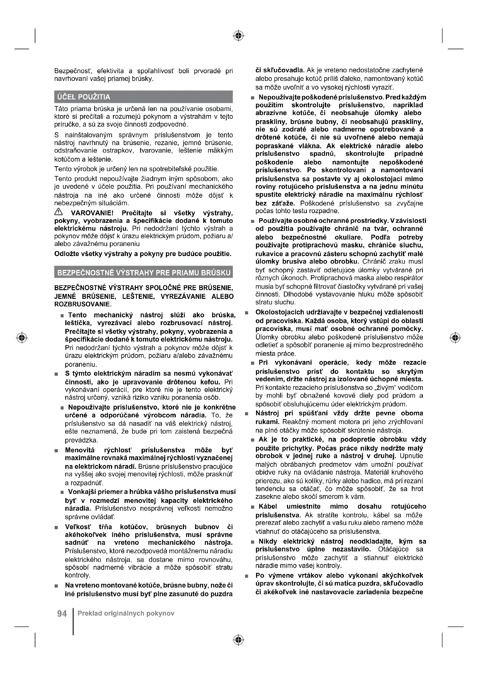 Preklad originálnych pokynovutiahnuté. Uvoľnené nastavovacie zariadenia sa môžu neočakávane posunúť s následnou stratou kontroly, pričom uvoľnené otáčajúce sa prvky budú silne odhodené. ■ Nikdy nespúšťajte elektrické náradie, keď ho nosíte na boku. Pri náhodnom kontakte s otáčajúcim sa príslušenstvom by vám mohlo zachytiť odev a stiahnuť príslušenstvo smerom na vaše telo. ■ Pravidelne čistite vzduchové prieduchy elektrického náradia. Ventilátor motora vťahuje prach dovnútra a nadmerné nazhromaždenie práškového kovu môže spôsobiť ohrozenie elektrickým prúdom. ■ Nepracujte s elektrickým náradím v blízkosti zápalných materiálov. Iskry mohli spôsobiť vznietenie týchto materiálov. ■ Nepoužívajte príslušenstvo, ktoré vyžadujú tekuté chladivá. Pri použití vody alebo iného tekutého chladiva by mohlo dôjsť k usmrteniu alebo úderu elektrickým prúdom. SPÄTNÝ NÁRAZ A SÚVISIACE VÝSTRAHY Spätný náraz je náhla reakcia na zovretý alebo pritlačený rotujúci kotúč, brúsny pás, kefku alebo iné príslušenstvo. Zovretie alebo pritlačenie spôsobí náhle spomalenie otáčajúceho sa príslušenstva, čo zase spôsobí nekontrolované uskočenie elektrického nástroja v opačnom smere ako otáčanie príslušenstva. Napríklad, ak obrobok priškrtí alebo pritlačí rozbrusovací kotúč, okraj kotúča vstupujúceho do bodu priškrtenia môže spôsobiť jeho vrytie do povrchu materiálu, čo spôsobí vytiahnutie alebo vykopnutie kotúča. Kotúč môže buď vyskočiť dopredu alebo dozadu od obsluhujúcej osoby, v závislosti od smeru pohybu kotúča v momente priškrtenia. Za týchto podmienok môžu tiež prasknúť abrazívne kotúče. Spätný náraz je výsledok nesprávneho používania nástroja a/alebo nesprávnych prevádzkových postupov a možno mu predchádzať vykonávaním príslušných predbežných opatrení uvedených nižšie. ■ Udržiavajte pevný úchop elektrického náradia a vaše telo a rameno v polohe, ktorá vám umožní odolávať sile spätného nárazu. Dodržaním vhodných preventívnych opatrení môže obsluhujúca osoba regulovať sily spätného rázu. ■ Pri opracovávaní rohov, ostrých hrán a pod. buďte zvlášť opatrní. Zabráňte odskakovaniu a zadrhávaniu príslušenstva. Rohy, ostré hrany alebo odskakovanie majú tendenciu zadrhnúť príslušenstvo a spôsobiť stratu kontroly alebo spätný náraz. ■ Nepripevňujte ozubené pílové kotúče. Takéto ostria často spôsobujú spätný náraz a stratu kontroly ■ Hroty do materiálu vždy veďte v rovnakom smere, v akom rezná hrana z materiálu vychádza (čo je rovnaký smer, akým odlietavajú triesky). Pri posúvaní nástroja v nesprávnom smere dochádza k vystupovaniu reznej hrany hrotu nástroja z obrábaného predmetu a ťahaniu nástroja v smere tohto posunu. ■ Pri použití rotačných pilníkov, rezných kotúčov, vysokorýchlostných rezných kotúčov alebo kotúčov z karbidu volfrámu si obrábaný predmet vždy bezpečne uchyťte. Tieto kotúče sa už pri miernom vychýlení v drážke zasekávajú a spôsobujú spätný ráz. Keď sa zasekne rezný kotúč, zvyčajne sa zlomí. Keď sa zasekne rotačný pilník, vysokorýchlostný rezný kotúč alebo kotúč z karbidu volfrámu, môže vyskočiť z drážky a spôsobiť stratu kontroly nad nástrojom. BEZPEČNOSTNÉ VÝSTRAHY ŠPECIFICKÉ PRE BRÚSENIE