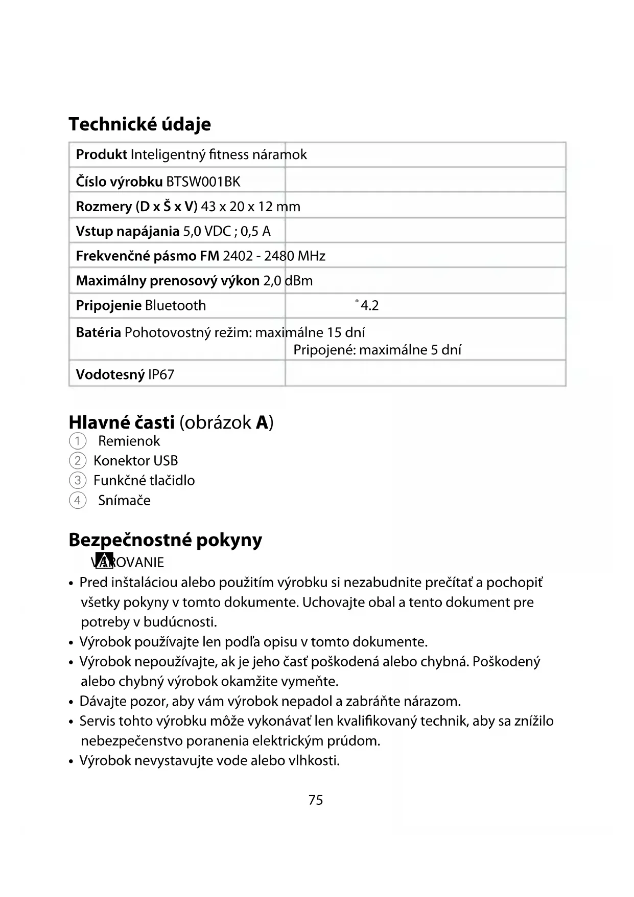 Rýchly návod Inteligentný tness náramok BTSW001BK Viac informácií nájdete v rozšírenom návode online:ned.is/btsw001bk Určené použitie Tento výrobok obsahuje inteligentné hodinky, ktoré vám dokážu poskytovať oznámenia o nových správach vo vašom telefóne, sledovať vaše športové aktivity a merať váš srdcový tep alebo telesnú teplotu. Tento výrobok je možné ovládať pomocou aplikácie Nedis SmartLife. Každá zmena výrobku môže mať následky na bezpečnosť, záruku a správne fungovanie.75 Technické údaje Produkt Inteligentný tness náramok Číslo výrobku BTSW001BK Rozmery (D x Š x V) 43 x 20 x 12 mm Vstup napájania 5,0 VDC ; 0,5 A Frekvenčné pásmo FM 2402 - 2480 MHz Maximálny prenosový výkon 2,0 dBm Pripojenie Bluetooth