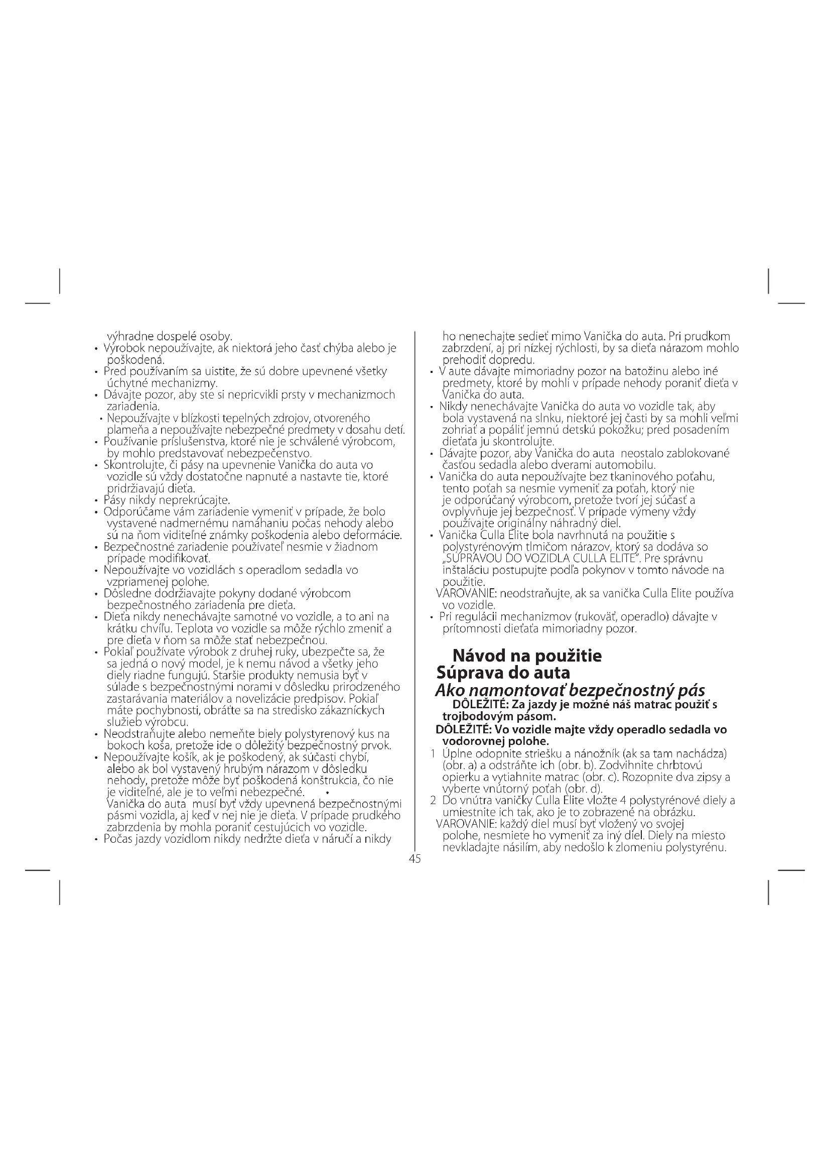 - Pri regulácii mechanizmov (rukoväť, operadlo) dávajte v prítomnosti dieťaťa mimoriadny pozor. Návod na použitie Súprava do auta Ako namontovať bezpečnostný pás DÔLEŽITÉ: Za jazdy je možné náš matrac použiť s trojbodovým pásom. DÔLEŽITÉ: Vo vozidle majte vždy operadlo sedadla vo vodorovnej polohe. 1 Úplne odopnite striešku a nánožník (ak sa tam nachádza) (obr. a) a odstráňte ich (obr. b). Zodvihnite chrbtovú opierku a vytiahnite matrac (obr. c). Rozopnite dva zipsy a vyberte vnútorný poťah (obr. d). 2 Do vnútra vaničky Culla Elite vložte 4 polystyrénové diely a umiestnite ich tak, ako je to zobrazené na obrázku. VAROVANIE: každý diel musí byť vložený vo svojej polohe, nesmiete ho vymeniť za iný diel. Diely na miesto nevkladajte násilím, aby nedošlo k zlomeniu polystyrénu.46 3 Vložte vnútorný poťah späť do polohy a pripevnite spodnú časť cez chrbtovú opierku. 4 Vložte matrac, ktorý sa dodáva s 3 otvormi na pás a pripevnite ju cez chrbtovú opierku. 5 BEZPEČNOSTNÝ PÁS S 3 BODMI UPNUTIA: Vsuňte medzinožný pás do otvoru v matraci (obr_a) a do otvorov rámu (obr_b), až kým ho nepresiahne (obr_c). 6 Popruhy umiestnite vedľa seba tak, aby ste ich mohli správne pripevniť ku kostre (obr_a). Zaskrutkujte dva konce popruhov do otvorov v matraci a kostre (obr_b). 7 Zaháknite ich na svorky na zadnej strane kostry, ako je uvedené na obrázku. 8 Popruhy správne pripevnené pod kostrou (obr_a) Na dokončenie pripevnenia popruhov, prekryte jazýčky (obr_b) a vsuňte ich do istiacej spony, dokiaľ sa neozve kliknutie (obr_c). Upevnenie vo vozidle s bezpečnostnými pásmi UPEVNENIE VANIČKY VO VOZIDLE: Zadné sedadlo vozidla (3-miestne) je vybavené 3 bezpečnostnými pásmi, pričom stredný môže byť určený na uchytenie hrudníka alebo panvy, v oboch prípadoch sa dá zaručiť upevnenie vaničky vo vozidle. Odporúčame umiestniť vaničku na zadnom sedadle tak, aby bola hlavová strana na strednom sedadle. 9 Vanička do auta upevnená vo vozidle s panvovým bezpečnostným pásom. 10 Vanička do auta upevnená vo vozidle s 3-bodovým bezpečnostným pásom. 11 Vanička do auta sa dá umiestniť aj v strednej polohe na zadnom 3-miestnom sedadle použitím dvoch vonkajších bezpečnostných pásov (obr_a) Vanička do auta sa nedá umiestniť ako na obr_b, pretože by sa dala upevniť vo vozidle iba bezpečnostnými pásmi orientovanými v opačnom smere. 12 Umiestnenie Vanička do auta na zadnom 2-miestnom sedadle. Vanička do auta sa dá umiestniť tak, aby bola obrátená časťou s nohami dieťaťa v jednom alebo druhom smere. Ak sedadlo vozidla nie je ploché, ale naklonené, treba ho vyrovnať vankúšmi. 13 Vezmite pás zadného sedadla, ohnite ho podľa obrázka (šípka_a) a navlečte do štrbiny kovovej spony súpravy pre auto (šípka_b). 14 Vložte červenú páčku kovovej spony súpravy pre auto do ohnutého pásu (šípka_c). Priblížte kovovú sponu čo najviac k sedadlu, aby sa uľahčilo následné pripnutie k vaničke (šípka_d). 15 Pripnite spojku súpravy pre auto ku krúžku vaničky a napnite pás, aby vanička z väčšej časti priliehala k sedadlu. Rovnako postupujte na druhej strane vaničky. 16 Vanička do auta pripevnená v aute. 17 ODPOJENIE VANIČKY Z AUTA: stlačením regulačného tlačidla na spojke podľa obrázka pásy povoľte. Odpojte hák spojky na súprave pre auto od krúžku vaničky. DÔLEŽITÉ: súprava pre auto môže zostať natrvalo pripojená k pásom auta. Stačí jednoduchým pohybom pripojiť alebo odpojiť sponu súpravy pre auto od krúžku vaničky (bod 13). DÔLEŽITÉ: súpravu do vozidla nenechávajte pripevnenú na bezpečnostnom páse, ak ho bude používať dospelá osoba. Ako uložiť dieťa do Vanička do auta 18 3-BODOVÝ BEZPEČNOSTNÝ POSTROJ: uvolnite popruhy stlačením spony (obr_a) a potiahnutím za ne (obr_b). Operáciu opakujte pre oba popruhy. 19 stlačte červené tlačidlo (obr_a) a uvoľnite pásy z priehradky medzi nohami (obr_b). 20 Dieťa umiestnite do koša. Prekryte jazýčky (obr_b) a vsuňte ich do istiacej spony, dokiaľ sa neozve kliknutie (obr_c). 21 Dieťa musí byť vnútri Vanička do auta dobre pripevnené. Ak sú pásy voľné, skráťte ich potiahnutím koncov pásov. Pásy musia dobre priliehať, aby bola v prípade nehody zaručená bezpečnosť dieťaťa. Nechajte minimálnu voľnosť (na hrúbku jedného prsta medzi pásom a hrudníkom dieťaťa). 22 ODMONTUJTE PÁSY: aby ste odmontovali pásy od kostry Vanička do auta, vsuňte pracky medzinožného pásu do otvorov pod kostrou a vytiahnite (obr_a). Aby ste vytiahli úpony spod kostry, uvoľnite ich z čapov a vsuňte ich do vlastných otvorov (obr_b). 23 Návod na použitie uložte za matrac tak, ako je to zobrazené.47 Sériové čísla 24 Na základni Vanička do auta sú uvedené údaje týkajúce sa dátumu výroby.