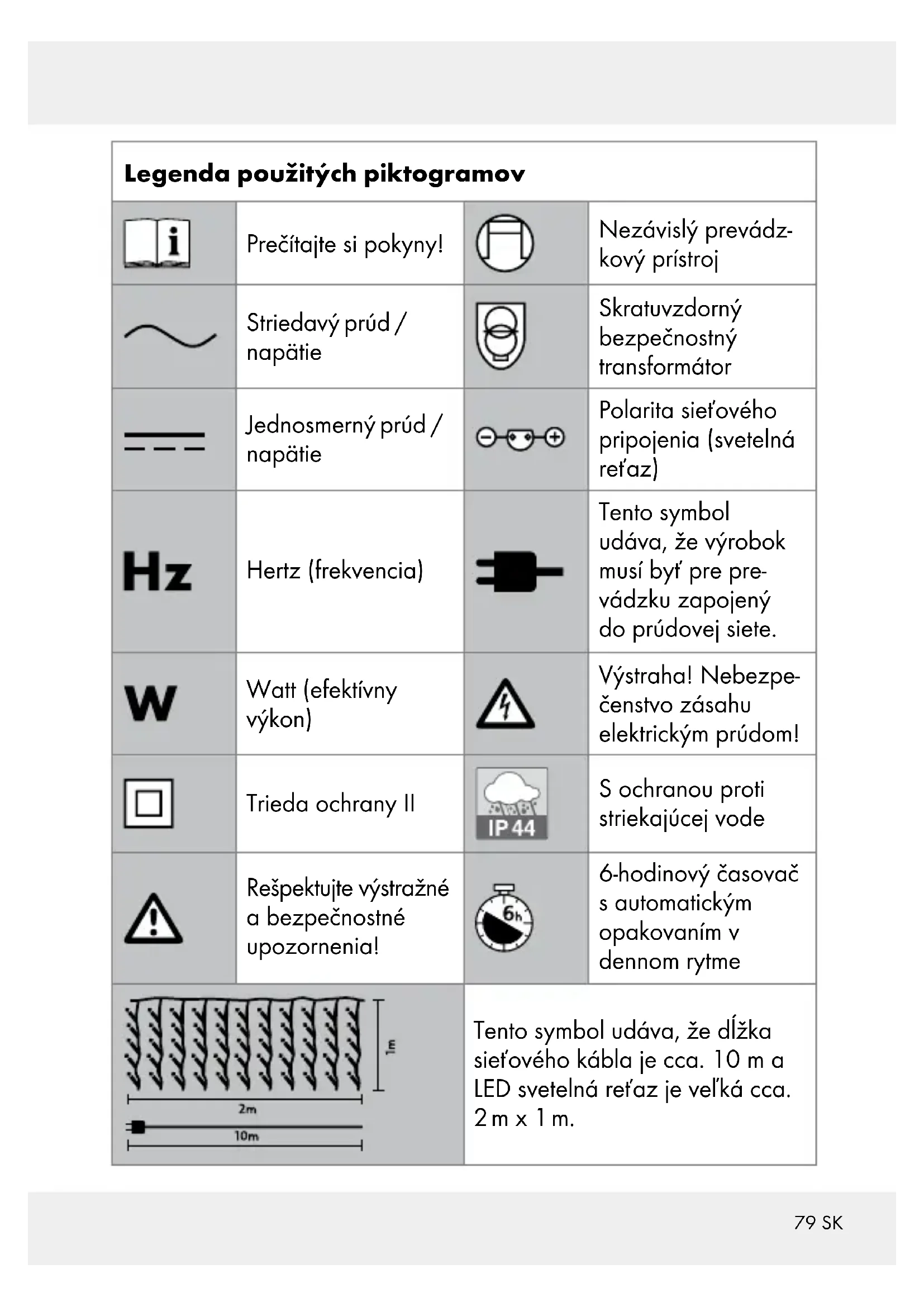 Menovité napätie primárne: 220–240 V∼, 50 / 60 Hz Menovité napätie sekundárne: 30 V , 3,6 W Druh ochrany: IP44 (s ochranou proti striekajúcej vode) Trieda ochrany: Sieťový diel (Model č. S036G300W8D) GS-certifikované.82 SK SELV: Ochranné nízke napätie (Safety extra low voltage) Ta: Maximálna teplota okolia Tc: Teplota schránky na uvedenom bode Bezpečnostné upozornenia V prípade škôd, ktoré vzniknú nedodržiavaním tohto návodu na ob- sluhu, zaniká garančný nárok! Pri následných škodách nepreberá vý- robca ručenie! V prípade vecných škôd alebo poranenia osôb, ktoré boli zapríčinené neodbornou manipuláciou alebo nedodržiavaním bezpečnostných pokynov, nepreberá výrobca ručenie!