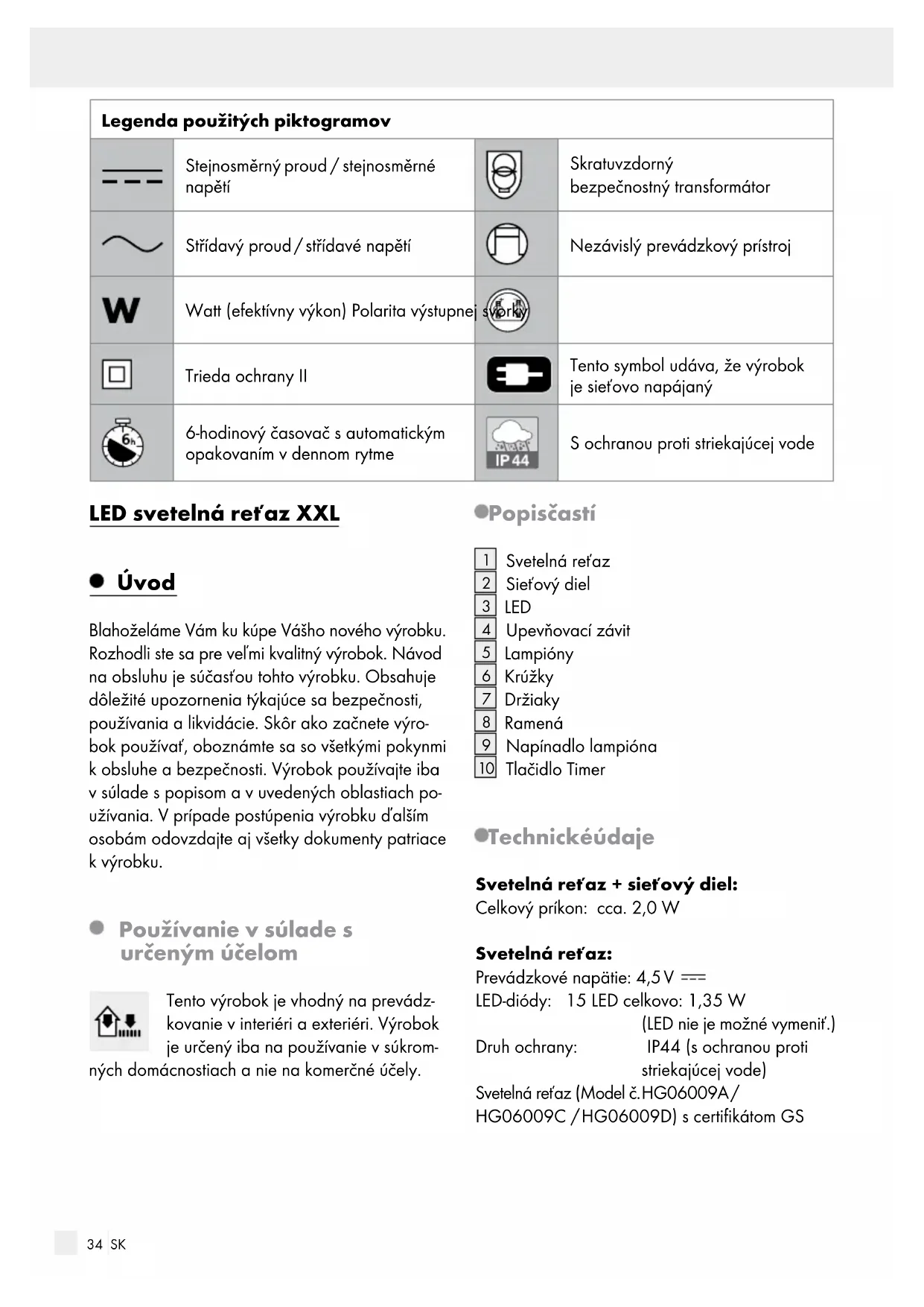 Tlačidlo Timer Technické údaje Svetelná reťaz + sieťový diel: Celkový príkon: cca. 2,0 W Svetelná reťaz: Prevádzkové napätie: 4,5 V LED-diódy: 15 LED celkovo: 1,35 W (LED nie je možné vymeniť.) Druh ochrany: IP44 (s ochranou proti striekajúcej vode) Svetelná reťaz (Model č. HG06009A / HG06009C / HG06009D) s certifikátom GS35 SK Sieťový diel: Menovité napätie primárne: 220‒240 V∼, 50‒60 Hz Menovité napätie sekundárne: 4,5 V , 1,35 W Trieda ochrany: II / Druh ochrany: IP44 (s ochranou proti striekajúcej vode) Sieťový diel (Model č. JT-DC4.5V1.35W-H4-IP44) s certifikátom GS SELV: Ochranné nízke napätie (Safety extra low voltage) Ta: Maximálna teplota okolia Tc: maximální Teplota tělesa předřazeného zařízení Obsah dodávky 1 LED svetelná reťaz XXL 15 lampášov 1 sieťový diel 1 návod na používanie Bezpečnostné upozornenia