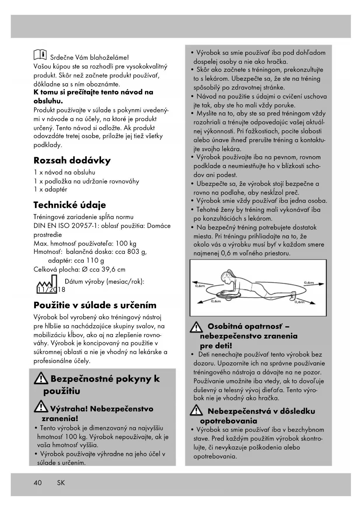 - Výrobok sa smie používať iba v bezchybnom stave. Pred každým použitím výrobok skontro- lujte, či nevykazuje poškodenia alebo opotrebovania. Srdečne Vám blahoželáme! Vašou kúpou ste sa rozhodli pre vysokokvalitný produkt. Skôr než začnete produkt používať, dôkladne sa s ním oboznámte. K tomu si prečítajte tento návod na obsluhu. Produkt používajte v súlade s pokynmi uvedený- mi v návode a na účely, na ktoré je produkt určený. Tento návod si odložte. Ak produkt odovzdáte tretej osobe, priložte jej tiež všetky podklady. Rozsah dodávky 1 x návod na obsluhu 1 x podložka na udržanie rovnováhy 1 x adaptér Technické údaje Tréningové zariadenie spĺňa normu DIN EN ISO 20957-1: oblasť použitia: Domáce prostredie Max. hmotnosť používateľa: 100 kg Hmotnosť: balančná doska: cca 803 g, adaptér: cca 110 g Celková plocha: Ø cca 39,6 cm Dátum výroby (mesiac/rok): 11/2018 Použitie v súlade s určením Výrobok bol vyrobený ako tréningový nástroj pre hlbšie sa nachádzajúce skupiny svalov, na mobilizáciu kĺbov, ako aj na zlepšenie rovno- váhy. Výrobok je koncipovaný na použitie v súkromnej oblasti a nie je vhodný na lekárske a profesionálne účely. Bezpečnostné pokyny k použitiu Výstraha! Nebezpečenstvo zranenia!