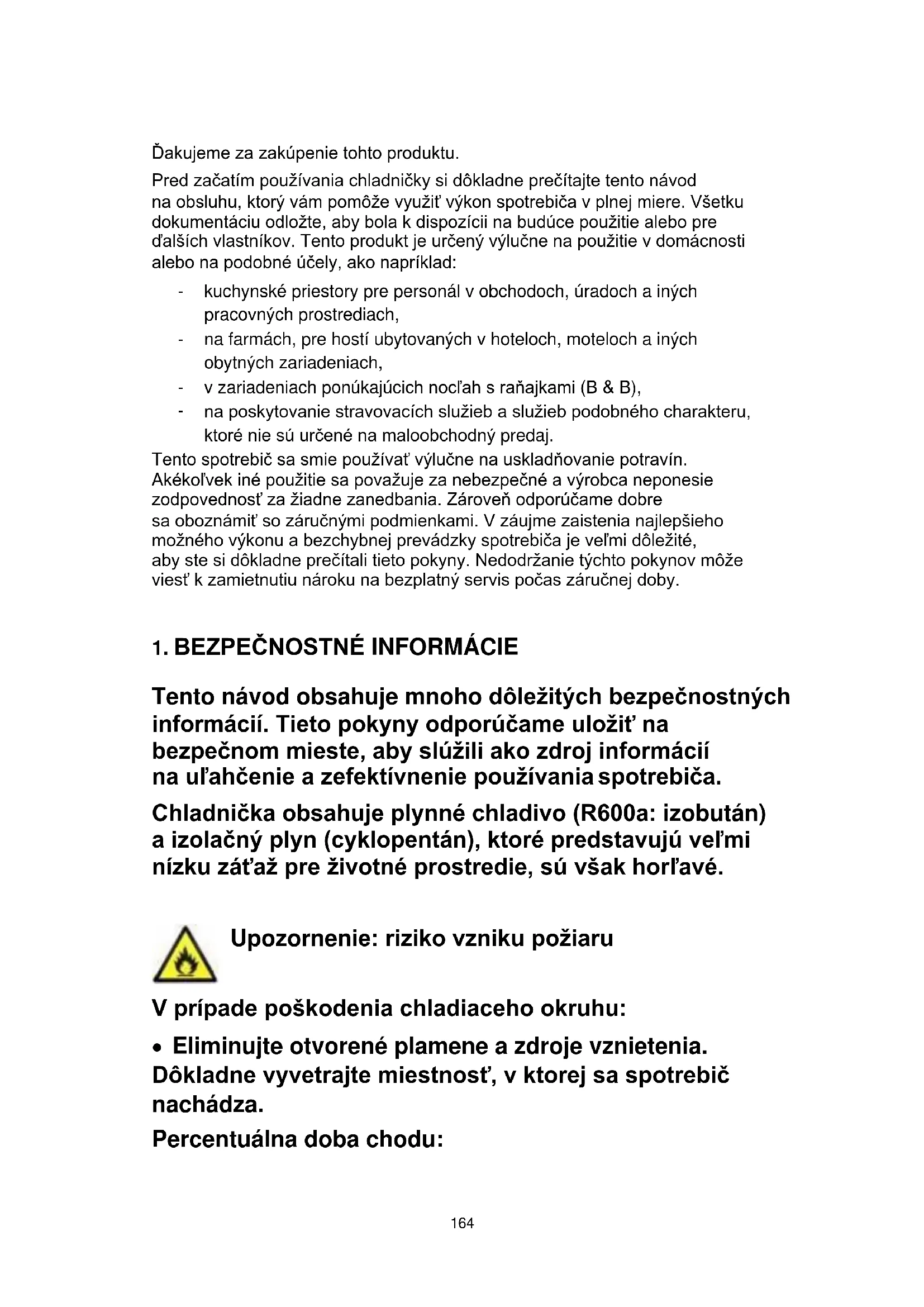 Tento návod obsahuje mnoho dôležitých bezpečnostných informácií. Tieto pokyny odporúčame uložiť na bezpečnom mieste, aby slúžili ako zdroj informácií na uľahčenie a zefektívnenie používania spotrebiča. Chladnička obsahuje plynné chladivo (R600a: izobután) a izolačný plyn (cyklopentán), ktoré predstavujú veľmi nízku záťaž pre životné prostredie, sú však horľavé. Upozornenie: riziko vzniku požiaru V prípade poškodenia chladiaceho okruhu: