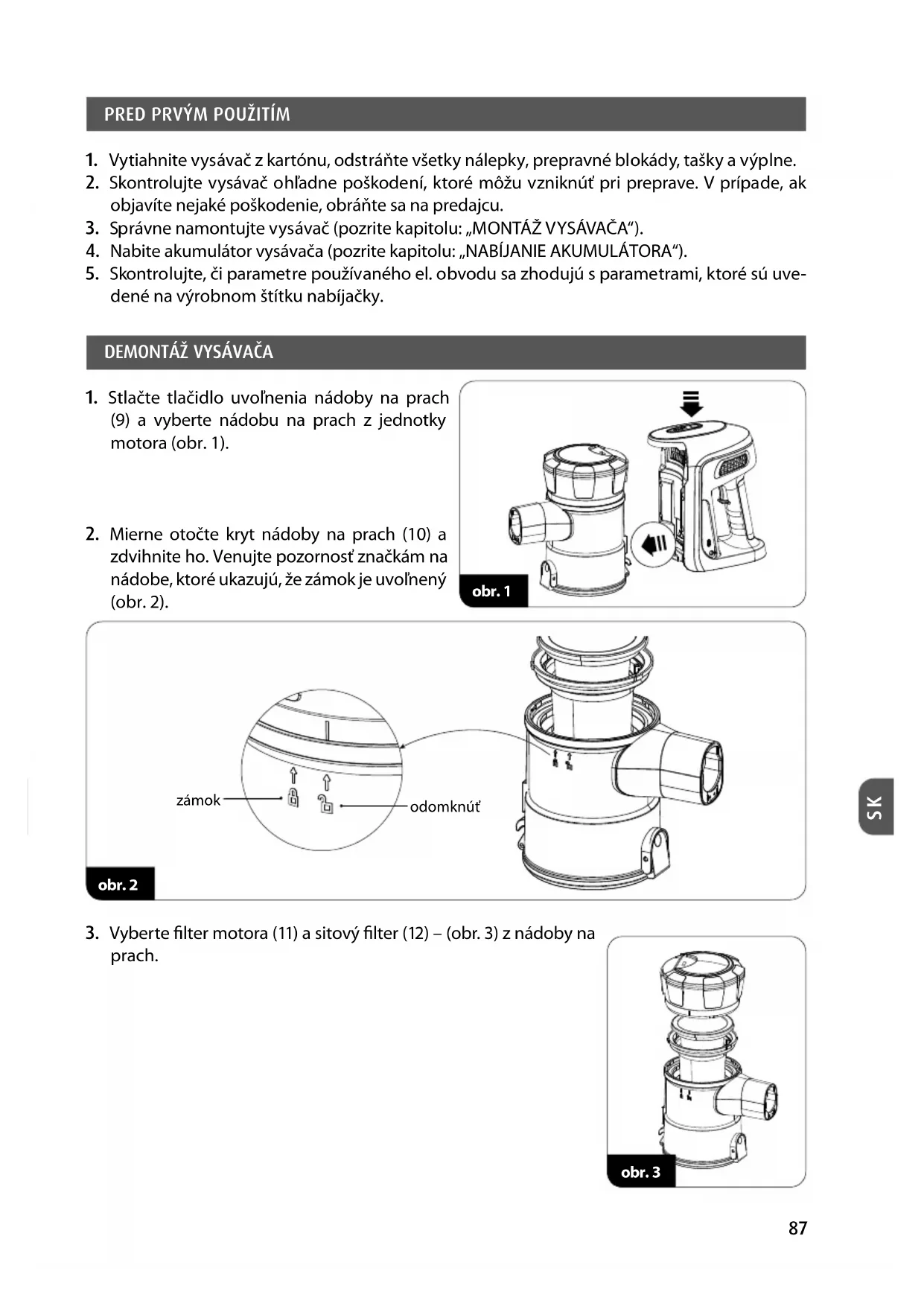 POZOR! Vysávač, nabíjačku ani akumulátor v žiadnom prípade neponárajte do vody! POZOR! Aby ste dosiahli najlepšiu účinnosť zariadenia, filtre a nádobu na prach vyčistite po každom použití. POZOR! Údržbu a servis vykonávajte iba vtedy, keď je vysávač vypnutý a je odpojený kábel nabíjačky! skrutka obr. 991