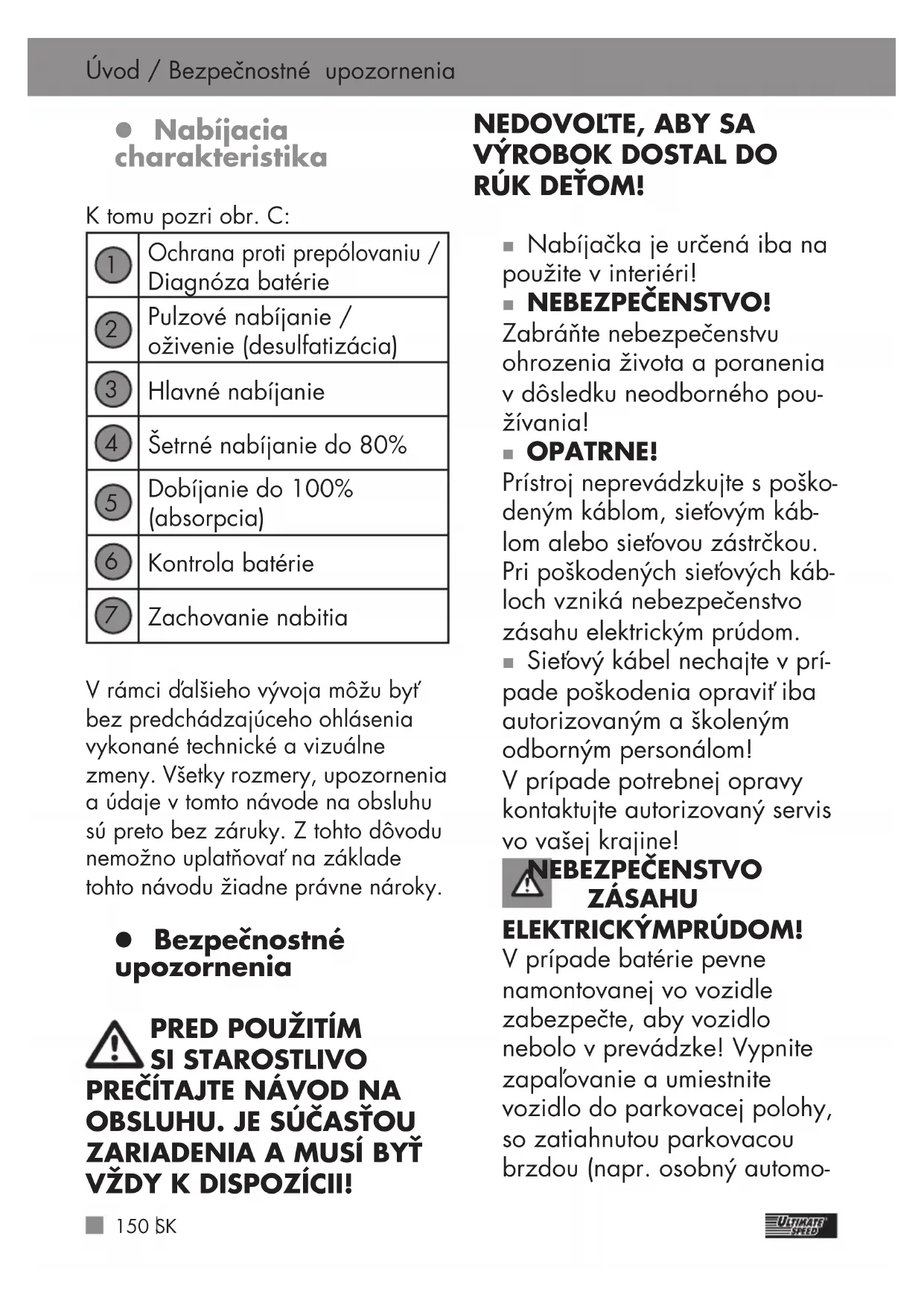 BOK DOSTAL DO RÚK DEŤOM! z Použitie v súlade sostanoveným účelom Ultimate Speed ULGD 10 A1 je viacstupňová nabíjačka autobatérií, ktorá je vhodná na nabíjanie a udr- žiavacie nabíjanie 12V (6-článko- vých) alebo 24V (2x6-článkových) olovených akumulátorov (batérií) s roztokom elektrolytu (WET), srohožami absorbujúcimi elektrolyt (AGM), s gélovým elektrolytom (GEL) alebo vápnikových akumulátorov. Zariadenie nie je vhodné na nabíja- nie lítiovo-iónových akumulátorov! Okrem toho je možné regenerovať Tabuľka použitých piktogramov / Úvod Tabuľka použitých piktogramov Vhodná na nabíjanie 12V batérií 24 V Vhodná na nabíjanie 24V batérií Jednosmerný prúd Trieda ochrany 2 12V 12V režim (program 1, 2, 3, 4 a