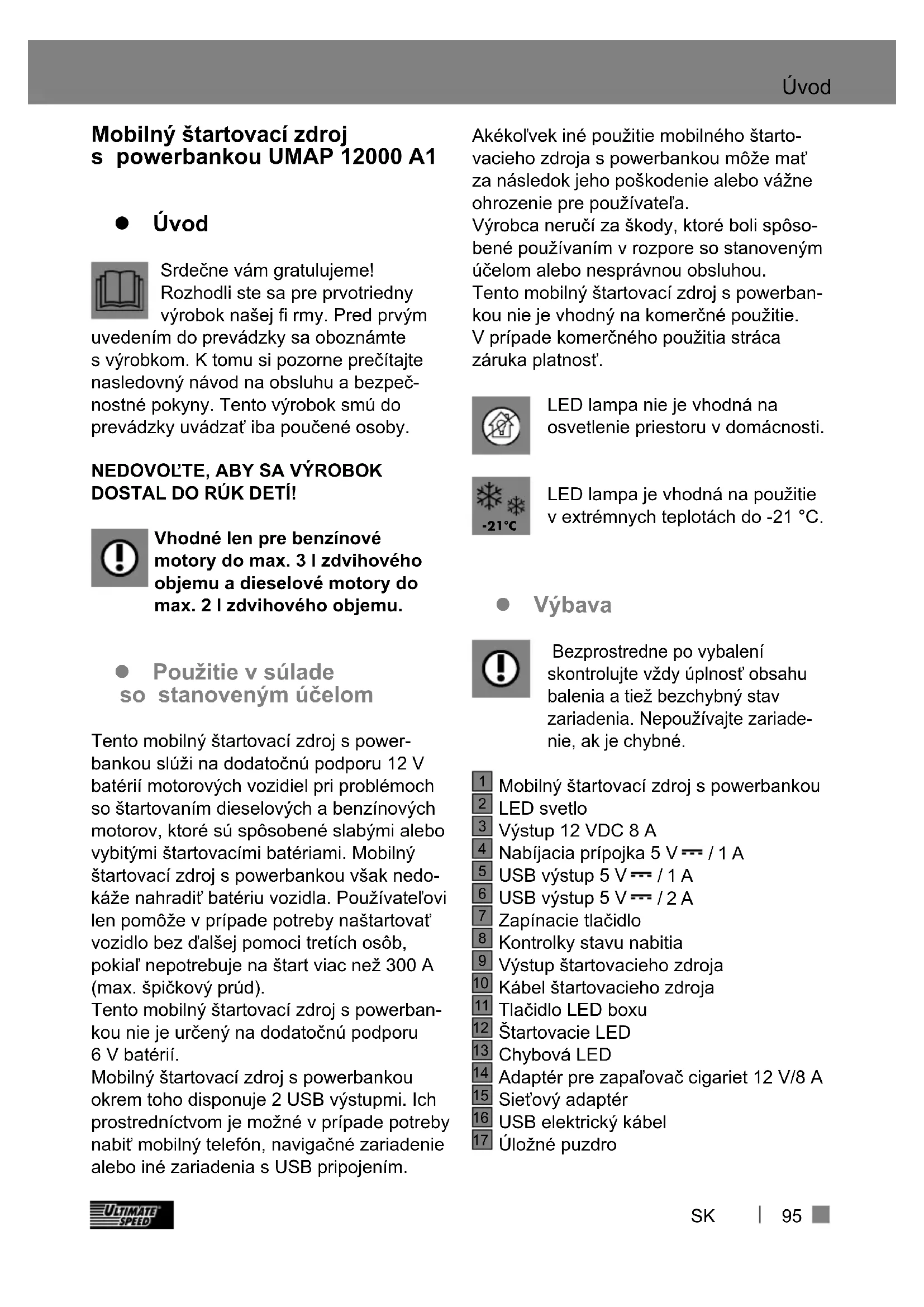 DOSTAL DO RÚK DETÍ! Vhodné len pre benzínové motory do max. 3 l zdvihového objemu a dieselové motory do max. 2 l zdvihového objemu. z Použitie v súlade so stanoveným účelom Tento mobilný štartovací zdroj s power- bankou slúži na dodatočnú podporu 12 V batérií motorových vozidiel pri problémoch so štartovaním dieselových a benzínových motorov, ktoré sú spôsobené slabými alebo vybitými štartovacími batériami. Mobilný štartovací zdroj s powerbankou však nedo- káže nahradiť batériu vozidla. Používateľovi len pomôže v prípade potreby naštartovať vozidlo bez ďalšej pomoci tretích osôb, pokiaľ nepotrebuje na štart viac než 300 A (max. špičkový prúd). Tento mobilný štartovací zdroj s powerban- kou nie je určený na dodatočnú podporu 6 V batérií. Mobilný štartovací zdroj s powerbankou okrem toho disponuje 2 USB výstupmi. Ich prostredníctvom je možné v prípade potreby nabiť mobilný telefón, navigačné zariadenie alebo iné zariadenia s USB pripojením. Akékoľvek iné použitie mobilného štarto- vacieho zdroja s powerbankou môže mať za následok jeho poškodenie alebo vážne ohrozenie pre používateľa. Výrobca neručí za škody, ktoré boli spôso- bené používaním v rozpore so stanoveným účelom alebo nesprávnou obsluhou. Tento mobilný štartovací zdroj s powerban- kou nie je vhodný na komerčné použitie. V prípade komerčného použitia stráca záruka platnosť. LED lampa nie je vhodná na osvetlenie priestoru v domácnosti. -21°C LED lampa je vhodná na použitie v extrémnych teplotách do -21 °C. z Výbava Bezprostredne po vybalení skontrolujte vždy úplnosť obsahu balenia a tiež bezchybný stav zariadenia. Nepoužívajte zariade- nie, ak je chybné.