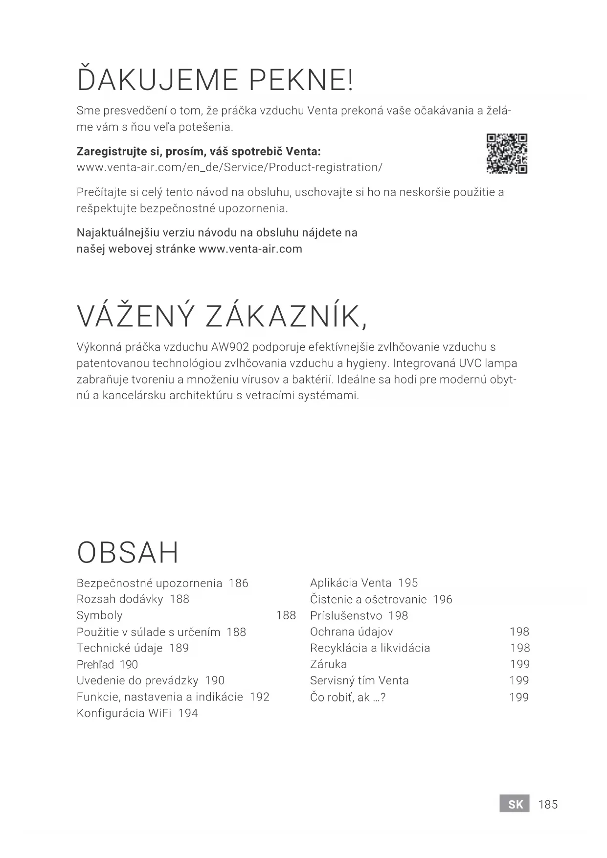 Případně aktualizujte operační systém Vaše chytrého telefonu resp. tabletu.185DE 185SK Bezpečnostné upozornenia 186 Rozsah dodávky 188 Symboly 188 Použitie v súlade s určením 188 Technické údaje 189 Prehľad 190 Uvedenie do prevádzky 190 Funkcie, nastavenia a indikácie 192 Konfigurácia WiFi 194 Aplikácia Venta 195 Čistenie a ošetrovanie 196 Príslušenstvo 198 Ochrana údajov 198 Recyklácia a likvidácia 198 Záruka 199 Servisný tím Venta 199 Čo robiť, ak …? 199 ĎAKUJEME PEKNE! Sme presvedčení o tom, že práčka vzduchu Venta prekoná vaše očakávania a želá- me vám s ňou veľa potešenia. Zaregistrujte si, prosím, váš spotrebič Venta: www.venta-air.com/en_de/Service/Product-registration/ Prečítajte si celý tento návod na obsluhu, uschovajte si ho na neskoršie použitie a rešpektujte bezpečnostné upozornenia. Najaktuálnejšiu verziu návodu na obsluhu nájdete na našej webovej stránke www.venta-air.com VÁŽENÝ ZÁKAZNÍK, Výkonná práčka vzduchu AW902 podporuje efektívnejšie zvlhčovanie vzduchu s patentovanou technológiou zvlhčovania vzduchu a hygieny. Integrovaná UVC lampa zabraňuje tvoreniu a množeniu vírusov a baktérií. Ideálne sa hodí pre modernú obyt- nú a kancelársku architektúru s vetracími systémami.