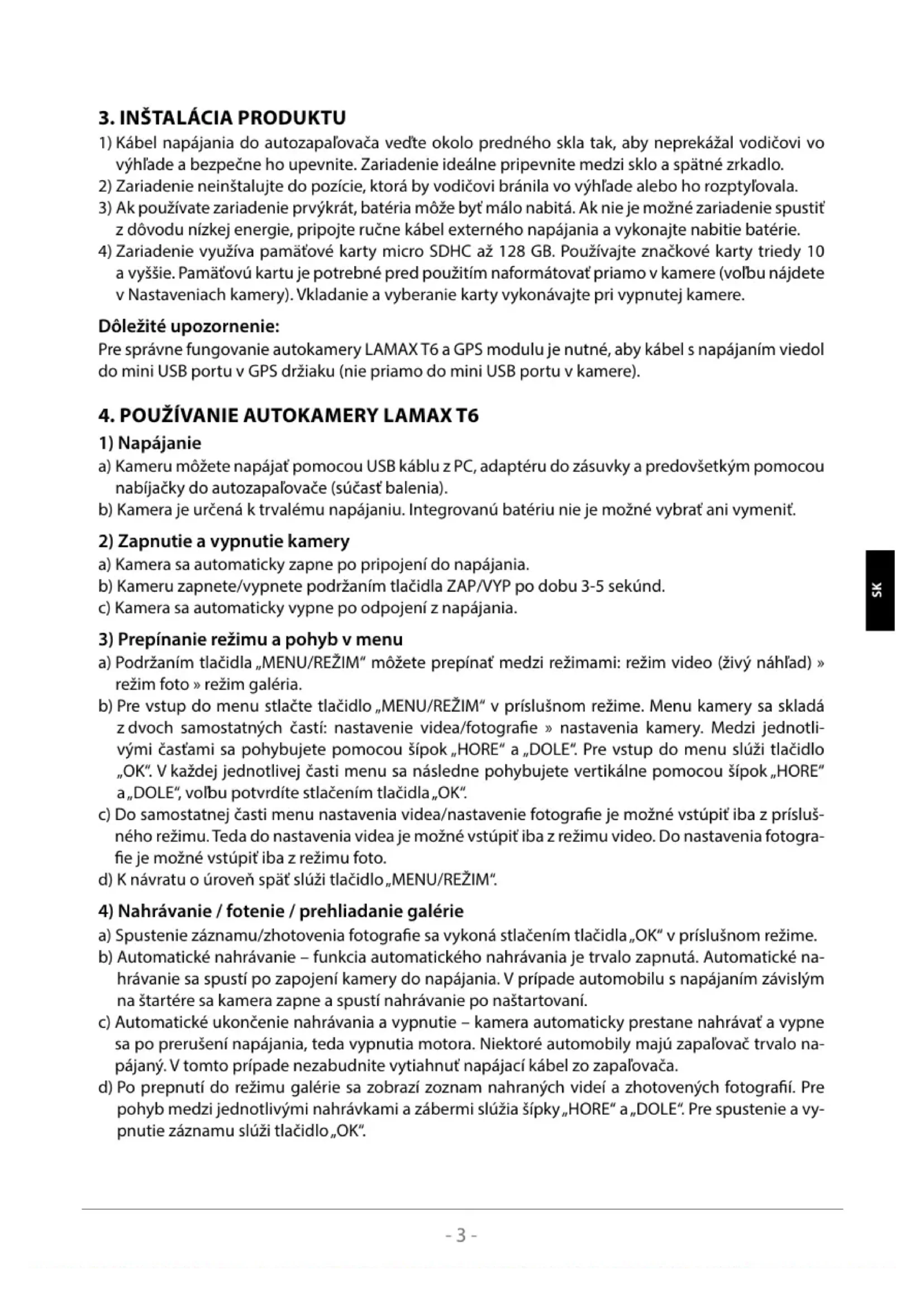 a vyššie. Pamäťovú kartu je potrebné pred použitím naformátovať priamo v kamere (voľbu nájdete v Nastaveniach kamery). Vkladanie a vyberanie karty vykonávajte pri vypnutej kamere. Dôležité upozornenie: Pre správne fungovanie autokamery LAMAX T6 a GPS modulu je nutné, aby kábel s napájaním viedol do mini USB portu v GPS držiaku (nie priamo do mini USB portu v kamere).