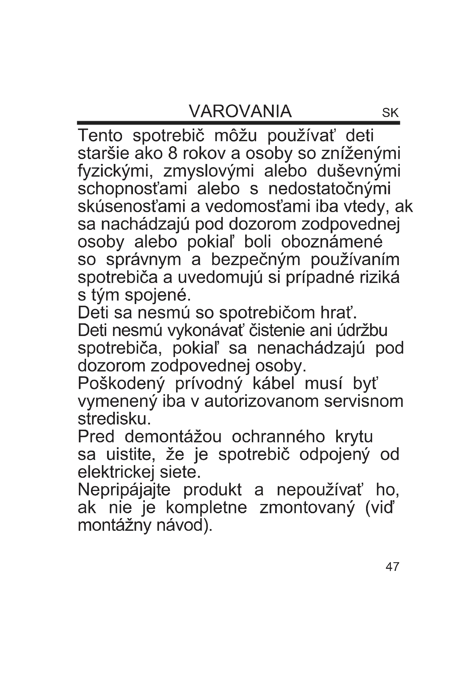 Dátum/podpis: ................................................................................................................................................................................... Záruka se nevztahuje. Zodpovědný zástupce za servis pro ČR na značky: ARDES, Guzzanti, Scarlett, Luxell, Graef ČERTES spol. s r.o. Donínská 83 463 34 Hrádek nad Nisou Tel./fax 482771487 - příjem oprav- servis. Tel./fax 482718718 - náhradní díly Mobil: 721018073, 731521116, 608719174 Pracovní doba 8 - 16,30 www: certes.info, e-mail: certes@certes.info Distributor PRIVEST s.r.o. Na Zlatnici 301/2 Praha 4, PSČ 147 00 www: www.privest.cz Email: info@privest.cz Telefon: (+420) 241 410 81947 Tento spotrebič môžu používať deti staršie ako 8 rokov a osoby so zníženými fyzickými, zmyslovými alebo duševnými schopnosťami alebo s nedostatočnými skúsenosťami a vedomosťami iba vtedy, ak sa nachádzajú pod dozorom zodpovednej osoby alebo pokiaľ boli oboznámené so správnym a bezpečným používaním spotrebiča a uvedomujú si prípadné riziká s tým spojené. Deti sa nesmú so spotrebičom hrať. Deti nesmú vykonávať čistenie ani údržbu spotrebiča, pokiaľ sa nenachádzajú pod dozorom zodpovednej osoby. Poškodený prívodný kábel musí byť vymenený iba v autorizovanom servisnom stredisku. Pred demontážou ochranného krytu sa uistite, že je spotrebič odpojený od elektrickej siete. Nepripájajte produkt a nepoužívať ho, ak nie je kompletne zmontovaný (viď montážny návod). VAROVANIA SK48 Upozornenie: Dôkladne si prečítajte tento návod na obsluhu, ktorý obsahuje dôležité pokyny týkajúce sa bezpečnej inštalácie, použitia a údržby spotrebiča. Uschovajte tento návod pre prípadné použitie v budúcnosti. Nedovoľte deťom hrať sa so spotrebičom. Tento spotrebič sa môže využívať len na účel, na ktorý bol navrhnutý; akékoľvek iné použitie je nesprávne a nebezpečné. Výrobca nenesie žiadnou zodpovednosť za poškodenia spôsobené nevhodným a/alebo nesprávnym použitím. Toto zariadenie NIE JE vhodné na použitie v explozívnom prostredí (v prítomnosti horľavých látok ako je benzín, výpary, hmla alebo prach, v atmosférických podmienkach, kde sa po vznietení spaliny šíria ľahko vzduchom). Obalové materiály (plastové vrecká, polystyrén a pod.) držte mimo dosahu detí alebo nespôsobilých osôb, pretože predstavujú riziko. Inštalácia/zostavenie spotrebiča musí byť v súlade s pokynmi výrobcu. Nesprávny postup môže viesť k zraneniu osôb, zvierat alebo k poškodeniu majetku, za čo výrobca nenesie zodpovednosť. Spotrebič postavte a používajte na horizontálnom a stabilnom povrchu. Pred použitím skontrolujte stav spotrebiča a prívodného kábla. V prípade pochybností kontaktujte kvalikovaného technika. Pred pripojením spotrebiča k sieťovej zásuvke skontrolujte, či zodpovedajú hodnoty napájania (napätie a frekvencia) spotrebiča s parametrami elektrickej siete. Uistite sa, že je elektrická sieť vybavená správnym uzemnením v súlade s platnými predpisy. NEPRIPÁJAJTE spotrebič k mnohonásobnej zásuvke. Ak je to možné, vyhnite sa použitiu adaptérov alebo predlžovacích káblov; ak je ich použitie nutné, používajte len tie, ktoré vyhovujú platným bezpečnostným predpisom. Spotrebič nezapínajte pomocou externých časovačov alebo iných diaľkovo riadených systémov, ktoré nie sú uvedené v tomto návode. Spotrebič NEPOUŽÍVAJTE ani neskladujte v blízkosti zdrojov tepla (ohrievače, kachle a pod.). Spotrebič NEPONÁRAJTE do vody ani iných tekutín; v prípade pádu do vody HO NEVYŤAHUJTE, najskôr odpojte zástrčku od sieťovej zásuvky. Pred prvým použitím spotrebiča odstráňte všetky obalové materiály a štítky, ktoré by mohli brániť v správnej funkčnosti. Kábel pripájajte a odpájajte len suchými rukami. Pred pripojením sa uistite, že je tlačidlo zapnutia na spotrebiči v pozícii „OFF“ (vypnuté).49 Po použití odpojte zástrčku, aby ste zabránili prehriatiu (na prenášanie spotrebiča nepoužívajte kábel). Prívodný kábel neveďte cez ostré ani drsné plochy a v miestach, kde sa môže ľahko poškodiť. NEBLOKUJTE ani čiastočne vstup a výstup vzduchu a do spotrebiča nevkladajte cudzie predmety. Počas prevádzky sa nedotýkajte spotrebiča mokrými časťami tela a v každom prípade odporúčame použitie izolačného materiálu medzi vami a podlahou (napríklad obuv s gumovou podrážkou). Počas použitia udržiavajte spotrebič v bezpečnej vzdialenosti od predmetov a prípadne horľavých látok. V prípade poruchy alebo neštandardnej prevádzky spotrebiča ho ihneď vypnite, odpojte od elektrickej siete a skontrolujte príčinu poruchy, ak je to možné, s pomocou kvalikovanej osoby. Nevykonávajte žiadne činnosti, ktoré nie sú popísané v tomto návode (napríklad demontáž spotrebiča). Pred čistením, uskladnením, vykonávaním údržby alebo ak nebudete spotrebič používať dlhší čas, odpojte ho od elektrickej siete. Spotrebič používajte a skladujte len vo vnútri alebo ho chráňte pred slnkom, dažďom a prachom. Spotrebič nie je určený na použitie a skladovanie vonku. Čistenie a údržbu spotrebiča NESMÚ vykonávať deti bez dozoru dospelej osoby. Pred odpojením spotrebiča ho vypnite pomocou príslušného príkazu alebo tlačidla na ovládacom paneli. NEVEŠAJTE ventilátor na stenu a strop, ak nie je tento typ inštalácie povolený výrobcom. Spotrebič postavte do správnej vzdialenosti od predmetov alebo okolitých stien tak, aby jeho funkcia nespôsobila poškodenie. Spotrebič NEPOUŽÍVAJTE v blízkosti plynových sporákov alebo zdroja otvoreného ohňa. Spotrebič NEPOUŽÍVAJTE v blízkosti záclon a textílií. Spotrebič počas prevádzky NEZAKRÝVAJTE. Cez mriežku spotrebiča NEVKLADAJTE žiadne cudzie predmety. Spotrebič počas prevádzk