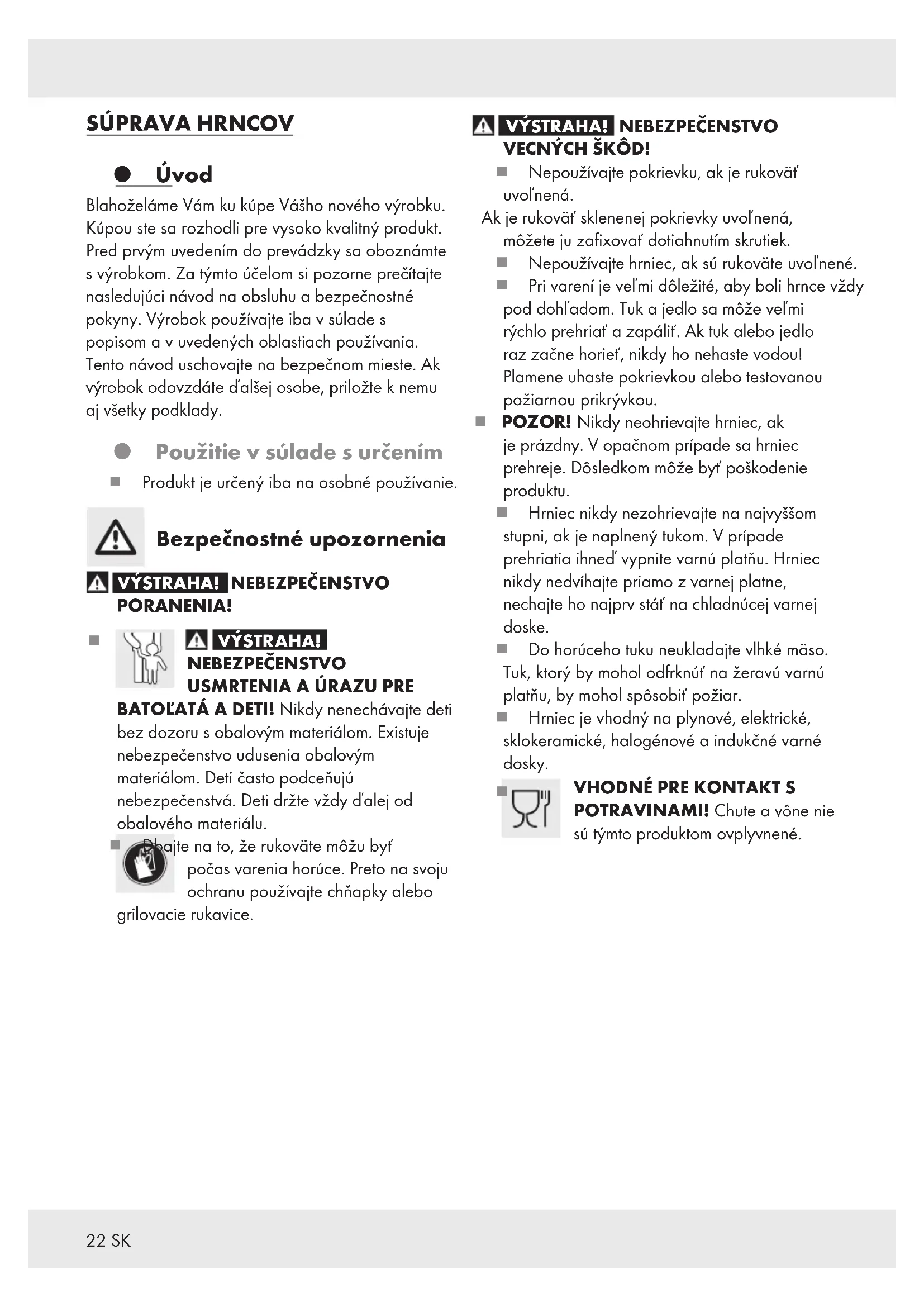POTRAVINAMI! Chute a vône nie sú týmto produktom ovplyvnené.23SK OPATRNE! Rozbitné, nie je odolné voči nárazom! Šetrite energiou! Aby sa zabránilo strate energie, podľa priemeru dna produktu zvoľte vhodnú varnú plochu. Typ hrnca Veľkosť hrnca Efektívny priemer dna (pribl.) Veľký hrniec: Ø 24 cm Ø 209 mm Hrniec na zeleninu: Ø 20 cm Ø 174 mm Malý hrniec: Ø 16 cm Ø 134 mm OPATRNE! ŠKRABANCE! Zabráňte šúchaniu produktu po sklokeramickej varnej doske! Predtým ako začnete s varením, odporúčame vám, aby ste utreli plochu varnej dosky a dno kuchynského riadu čistou handrou bez chlpov (napr. z mikrovlákna). Takto zabránite vzniku škrabancov. Do predhriateho prázdneho produktu nedávajte soľ resp. slanú vodu, môže to spôsobiť koróziu. To by, mimochodom, neviedlo k zníženiu výkonu produktu. Horúci produkt nikdy nechlaďte pod studenou tečúcou vodou. Tým by sa mohla poškodiť spodná strana produktu alebo z produktu odpadnúť. Upozornenie týkajúce sa indukčných varných dosiek Upozornenie: Za určitých podmienok môže vznikať hluk, ktorý spôsobujú elektromagnetické vlastnosti ohrievacieho zdroja a hrnca/panvice. To je normálne a nepredstavuje to žiadnu poruchu vašej indukčnej varnej dosky alebo nádob na varenie. Umiestnite hrniec/panvicu do stredu indukčného poľa. OPATRNE! Veľmi rýchle ohriatie! Varné nádoby pri predhrievaní neprehrejte. V prípade prehriatia musíte miestnosť dôkladne vyvetrať. Použitie Pred prvým použitím vyvarte produkt 2-až 3-krát vodou, aby sa úplne odstránili prípadné zvyšky z výroby. Nerezové hrnce so sklenenými pokrievkami sú vhodné do rúry. – Sklenená pokrievka odolná voči teplu do 180 °C. – Nerezové hrnce odolné voči teplu do 250 °C. Čistenie a starostlivosť Hrniec čistite horúcou vodou a bežnými čistiacimi prostriedkami.