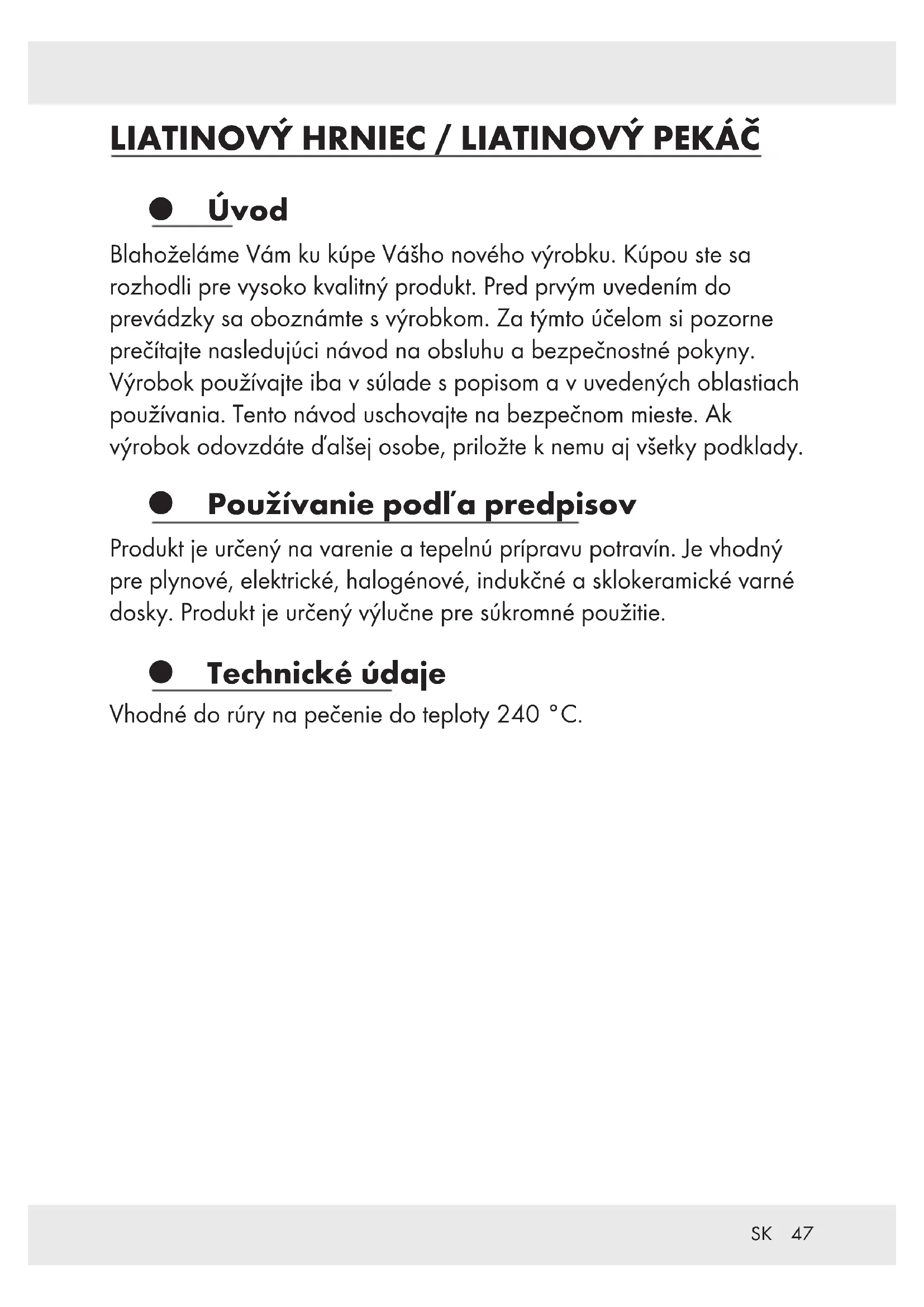 Úvod Blahoželáme Vám ku kúpe Vášho nového výrobku. Kúpou ste sa rozhodli pre vysoko kvalitný produkt. Pred prvým uvedením do prevádzky sa oboznámte s výrobkom. Za týmto účelom si pozorne prečítajte nasledujúci návod na obsluhu a bezpečnostné pokyny. Výrobok používajte iba v súlade s popisom a v uvedených oblastiach používania. Tento návod uschovajte na bezpečnom mieste. Ak výrobok odovzdáte ďalšej osobe, priložte k nemu aj všetky podklady. Používanie podľa predpisov Produkt je určený na varenie a tepelnú prípravu potravín. Je vhodný pre plynové, elektrické, halogénové, indukčné a sklokeramické varné dosky. Produkt je určený výlučne pre súkromné použitie. Technické údaje Vhodné do rúry na pečenie do teploty 240 °C.48 SK Bezpečnostné upozornenia USCHOVAJTE VŠETKY BEZPEČNOSTNÉ POKYNY A UPOZORNENIA PRE MOŽNÉ BUDÚCE POUŽITIE!